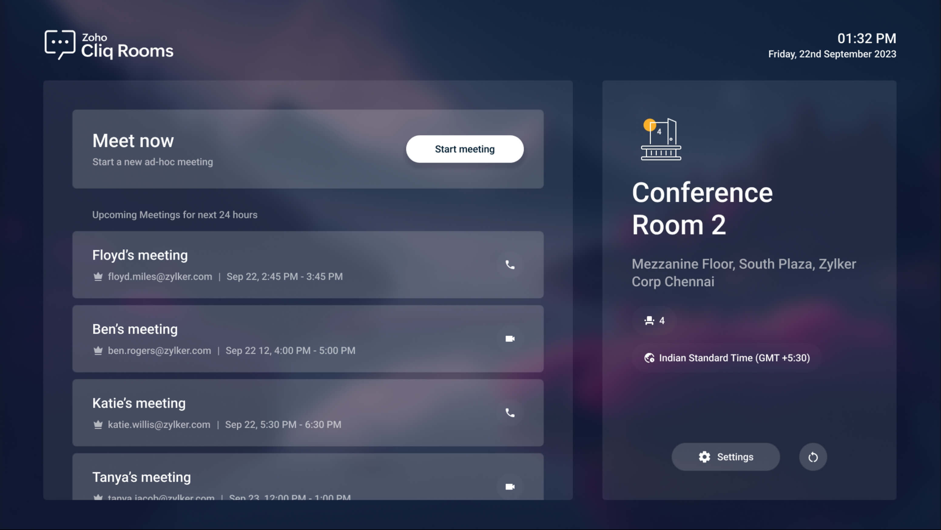 Make conference room meetings for your hybrid workforce effortless with Zoho Cliq. Configure your room devices to host Cliq meetings and allow employees to schedule meetings based on the room’s availability and seating capacity.