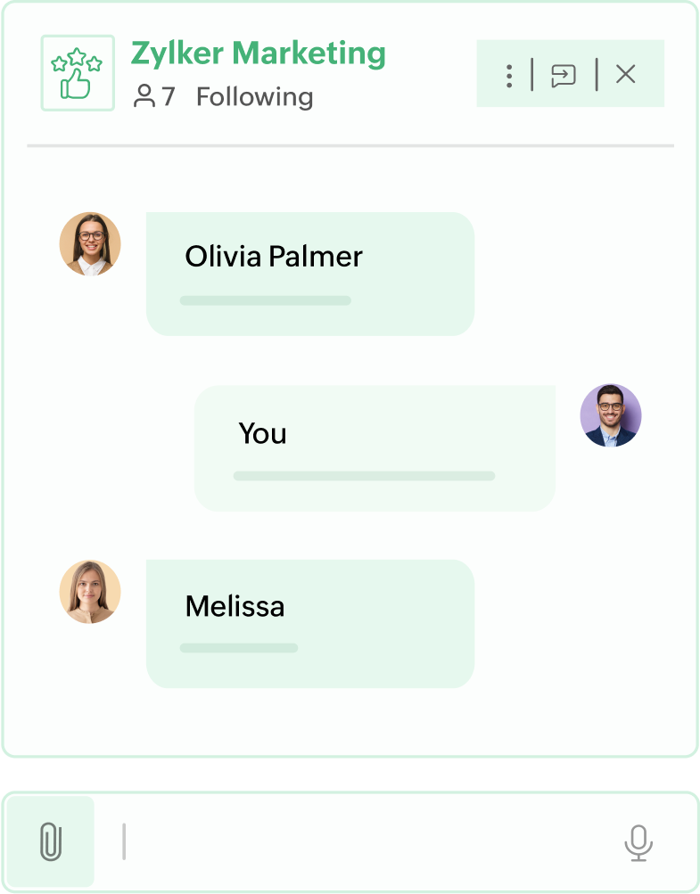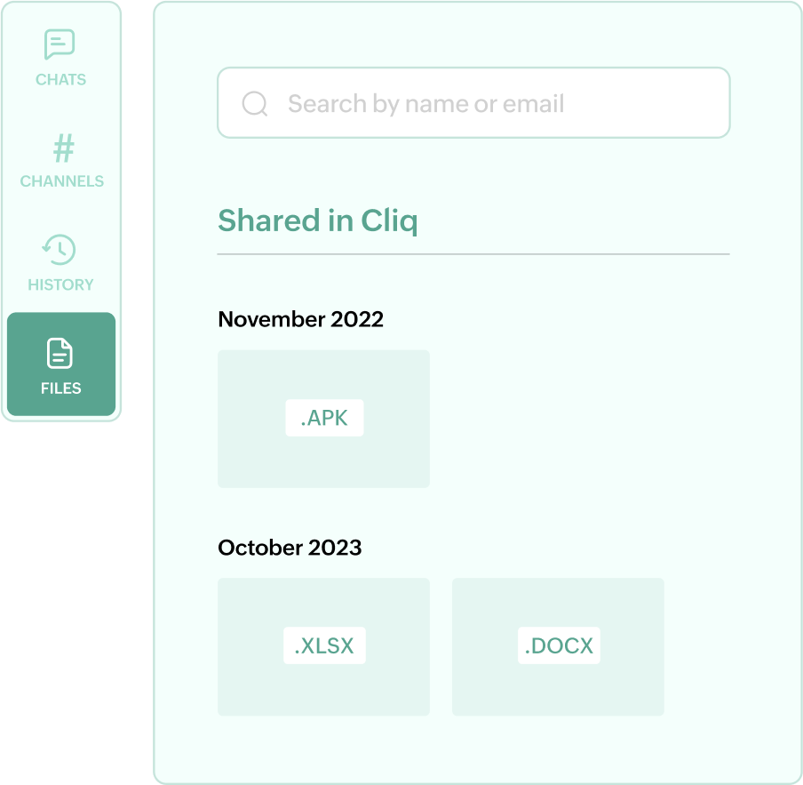 You don't have to ping marketers every time a prospect requests a slide deck or comparison document. Directly fetch the required materials from Zoho WorkDrive in your Cliq chat to share it with specific sales representatives. Plus, use Cliq's efficient search and filter functions to locate files and share them quickly.