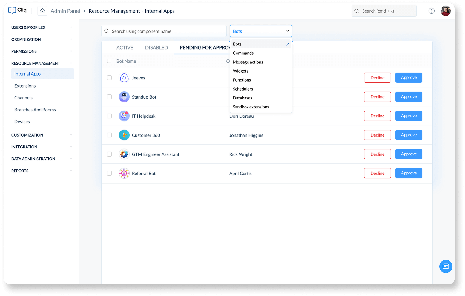EnhancementsYou can now, as an admin, view and manage internal app submissions like bots, commands, widgets, directly from the Admin Panel under Resource Management. This way you can approve or decline requests faster, all in one place.
