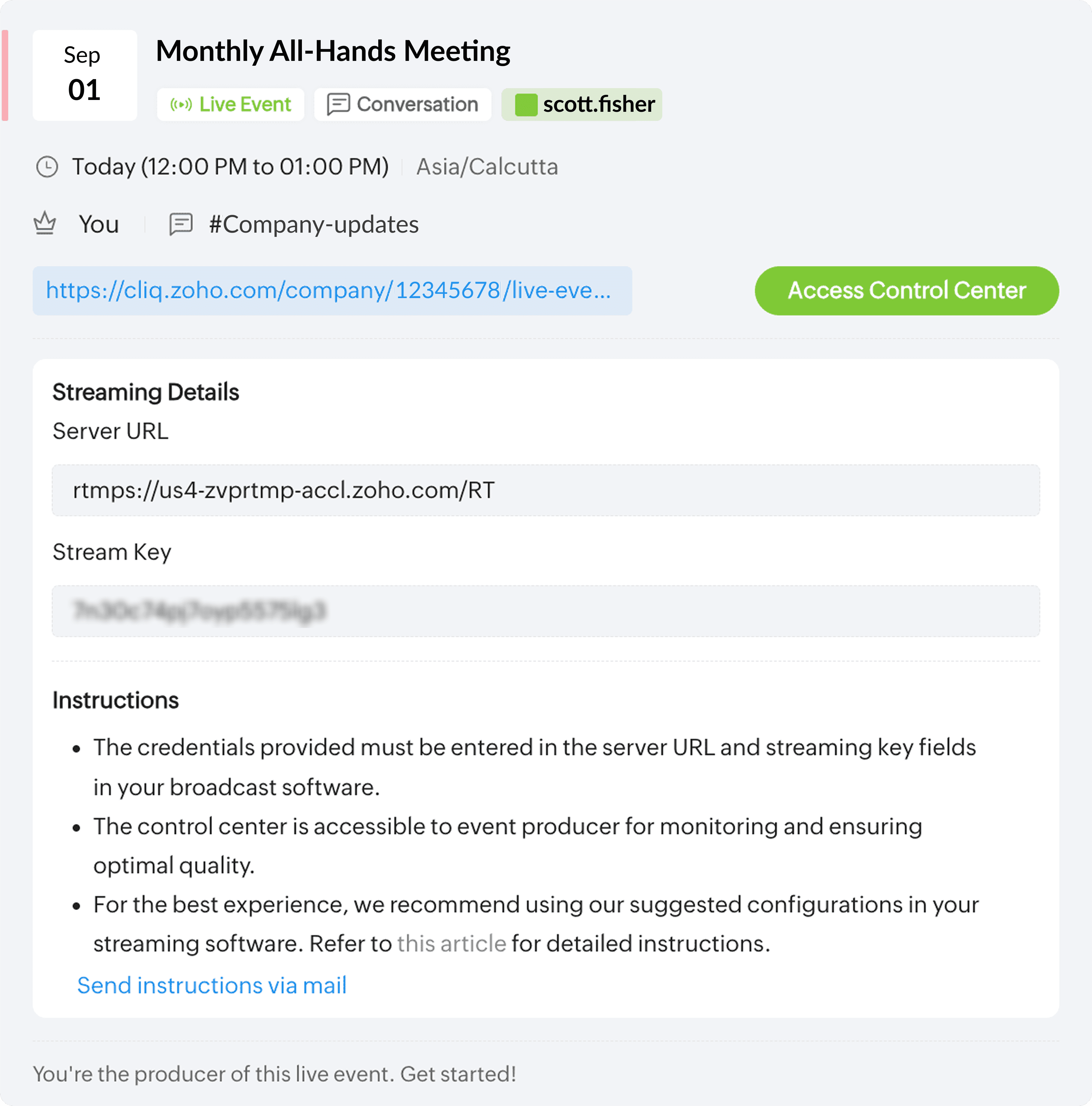 EnhancementsYou can now produce and stream Live Events in Zoho Cliq using external production software through the RTMP protocol. Once you schedule an event in Cliq, you’ll get a stream key and URL to connect with your external service. This lets you create richer, more professional live events and broadcast them directly to your Cliq audience.