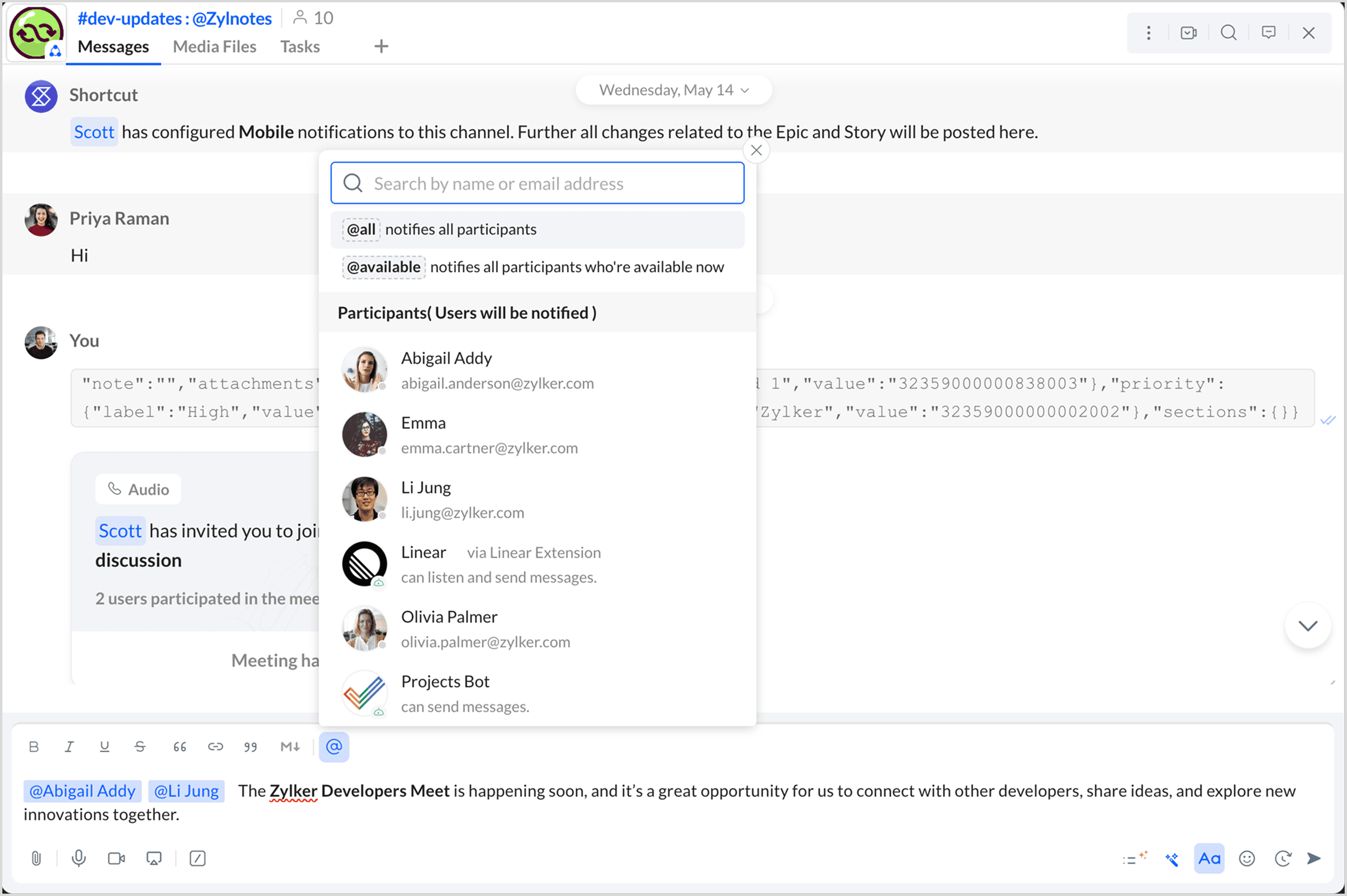 EnhancementsDraw attention in a group conversation or a channel easily! Use @participants to address everyone in the group or @available to get the attention of all group participants who are currently available in Cliq.