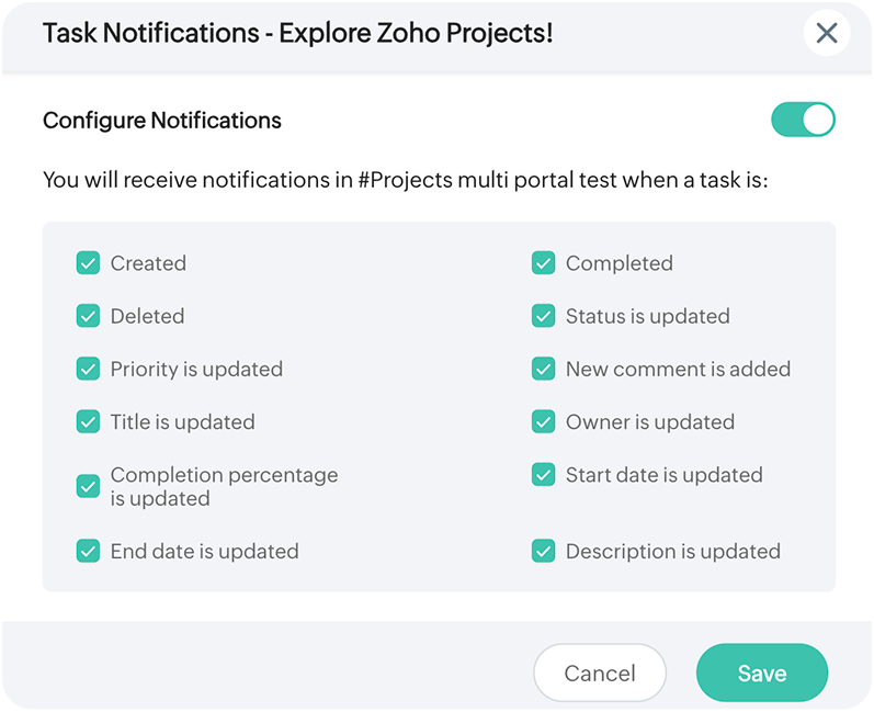 IntegrationsWe have updated the settings for sending Zoho Projects task updates to channels. In addition to a cleaner layout, you now have access to a central toggle button to easily turn all channel notifications on or off.