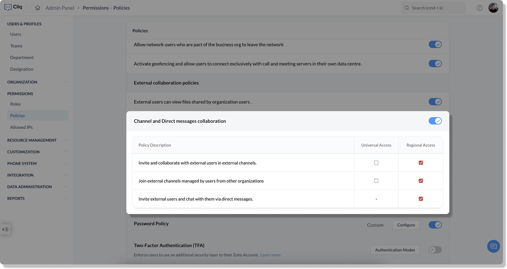 EnhancementsYou can now communicate with users who have Cliq accounts in different DCs (Data Centers) through external channels. It should be noted that for you to do so, your admin must enable worldwide communication policies in the admin panel.