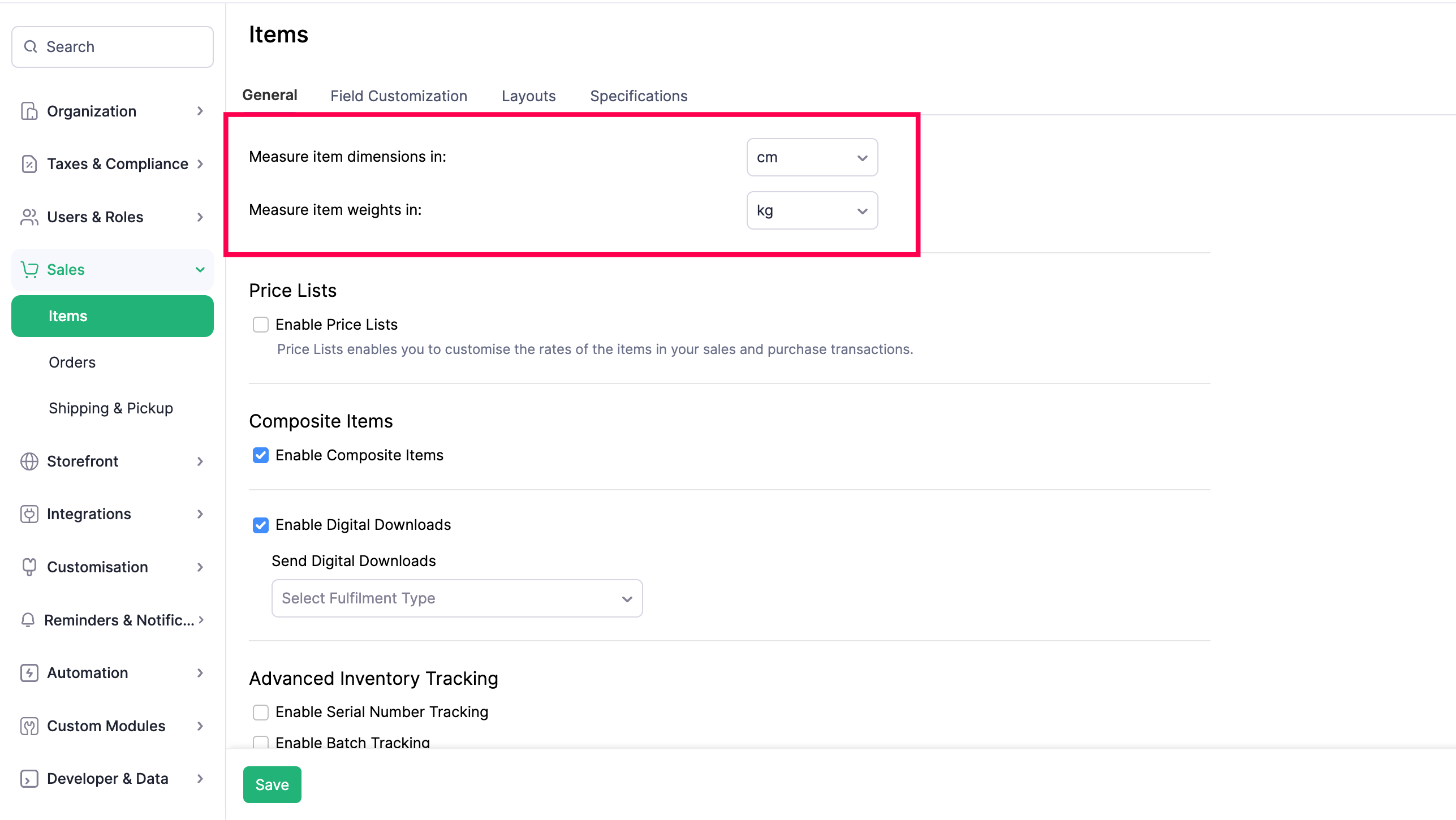 You can select measurement units to record the weight and dimensions of your items. Here’s how: