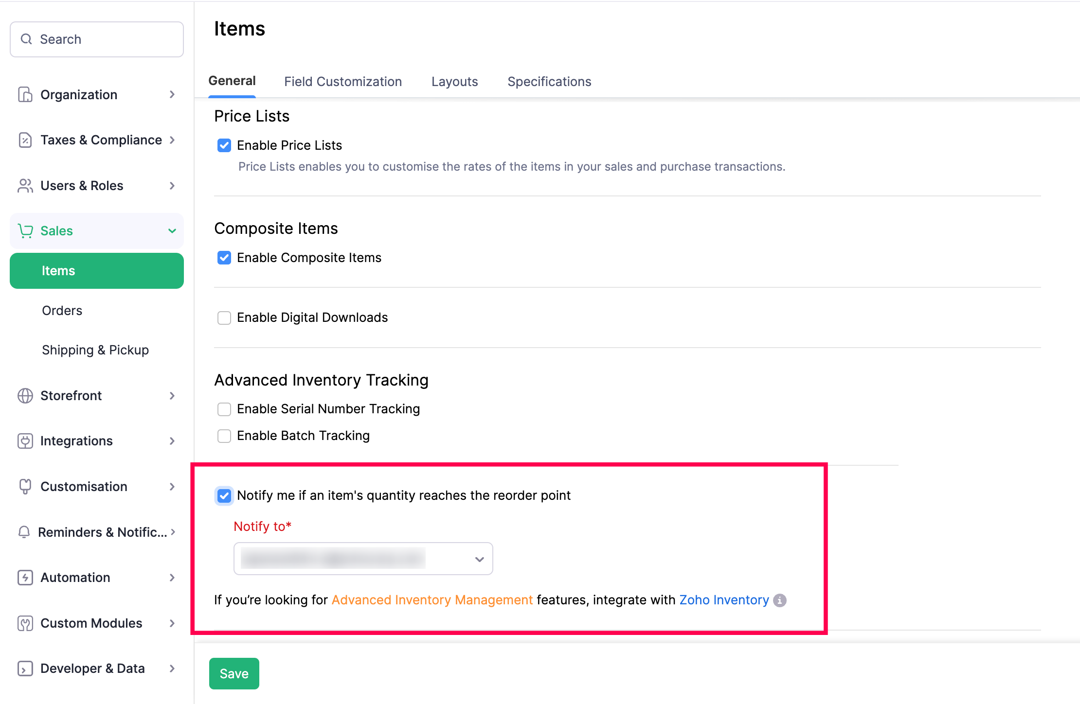 You can enable notifications to alert you when an item’s quantity reaches its reorder point to ensure timely restocking. Here’s how: