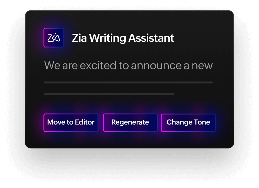 With Zia, crafting messages and generating content is easy. Your employees can communicate clearly and effectively, facilitating discussions across the organization.