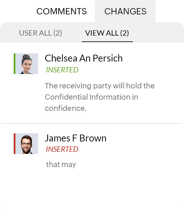 The contract owner can add internal stakeholders as collaborators with appropriate permissions. Based on their permissions, these collaborators can co-author, review, add comments, and set comment visibility. With automatic redlining, users can instantly spot changes made by other collaborators and accept or reject them. They can also reply to and resolve comments. The improved collaboration and visibility to contract terms for the stakeholders at the time of authoring reduces both the time taken to author contracts and the risks.