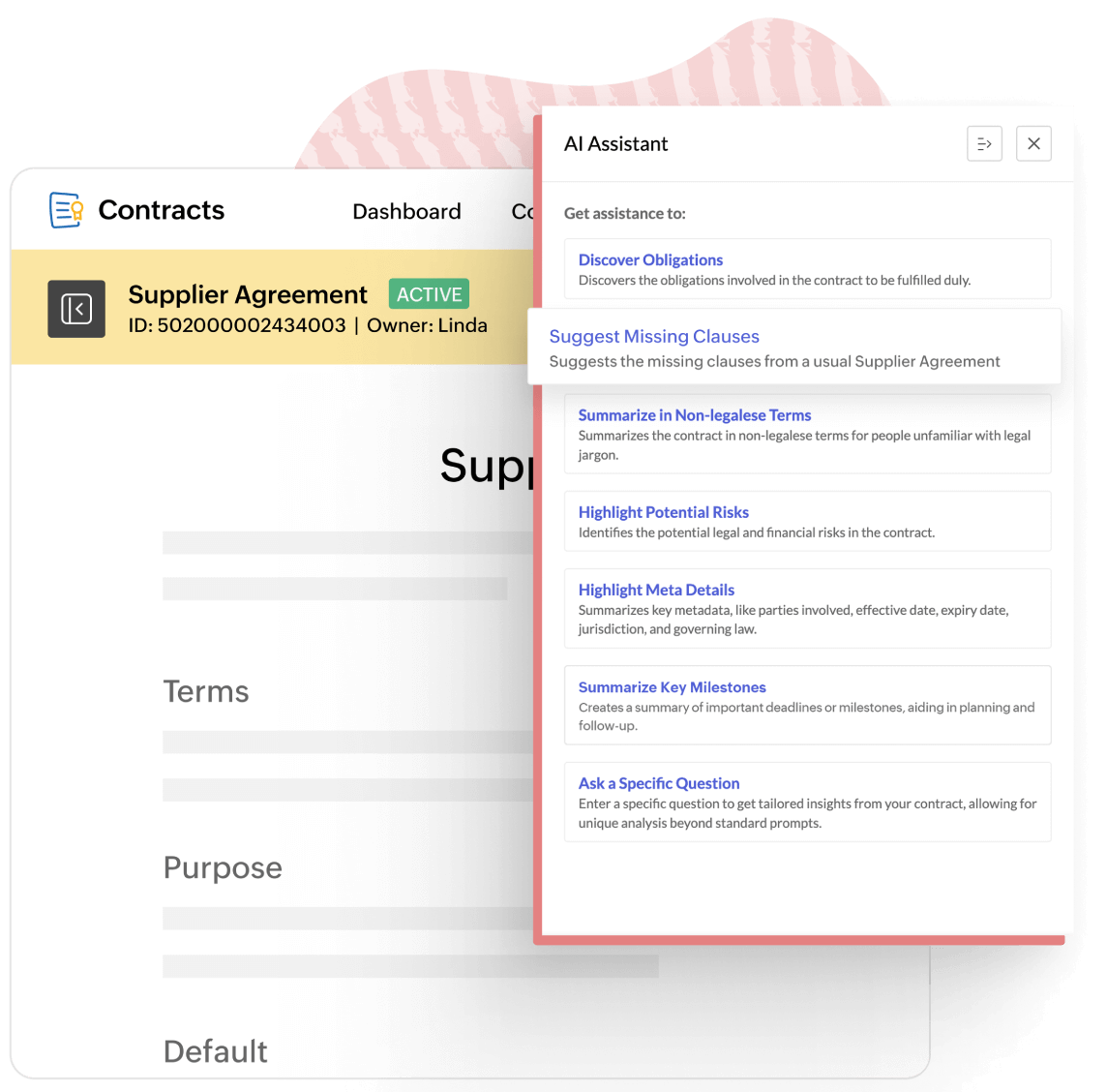 Accelerate your contract cycle times and minimize risks during contract authoring with the power of AI. The AI Assistant in Zoho Contracts streamlines the process by identifying and suggesting missing clauses, summarizing contracts in non-legalese terms, highlighting potential risks, and even translating key elements into regional languages. Now, you can draft contracts and clock faster contract turnaround times effortlessly.