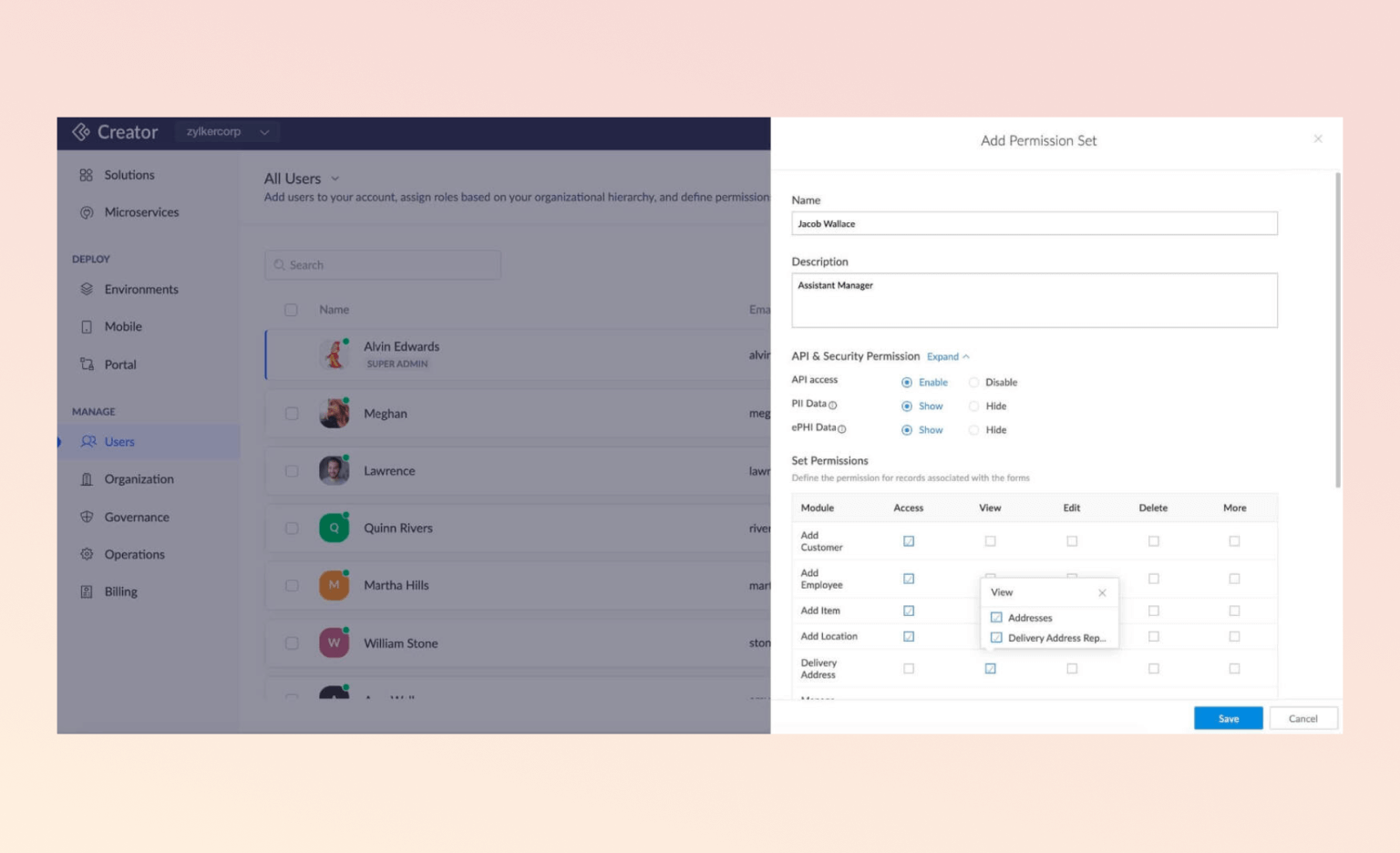 The automated user management feature in Zoho Creator facilitates organizations that regularly add new personnel to their system, as well as those that need to manage complex access permissions for a large group of users. This feature allows administrators to create login credentials automatically when they invite a user, assign roles, and customize permissions for each user, depending on their needs.