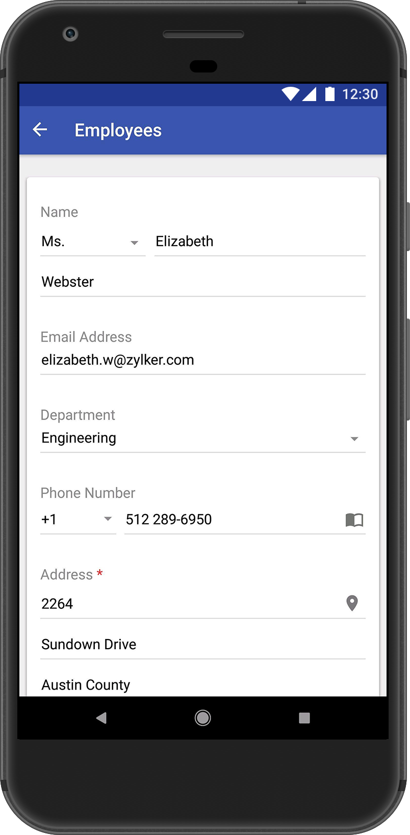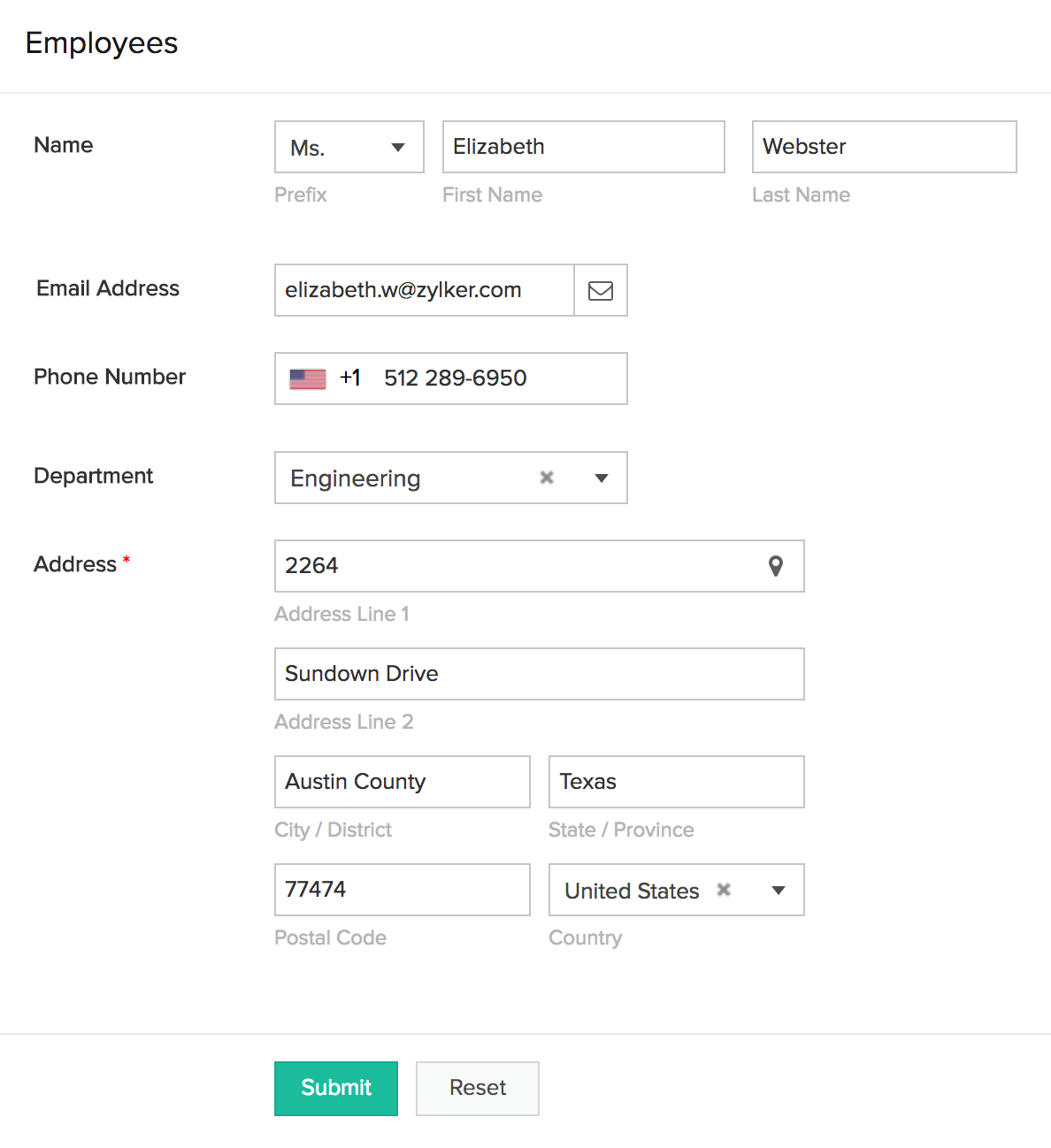 The fields in your form enable you to collect data from your users and store them in an organized manner. There are different types of fields available in Zoho Creator, each designed to enable your users to enter or submit a specific kind of data. For example: name, email address, phone number, address, files, images, audio, video. Below is how a form looks: