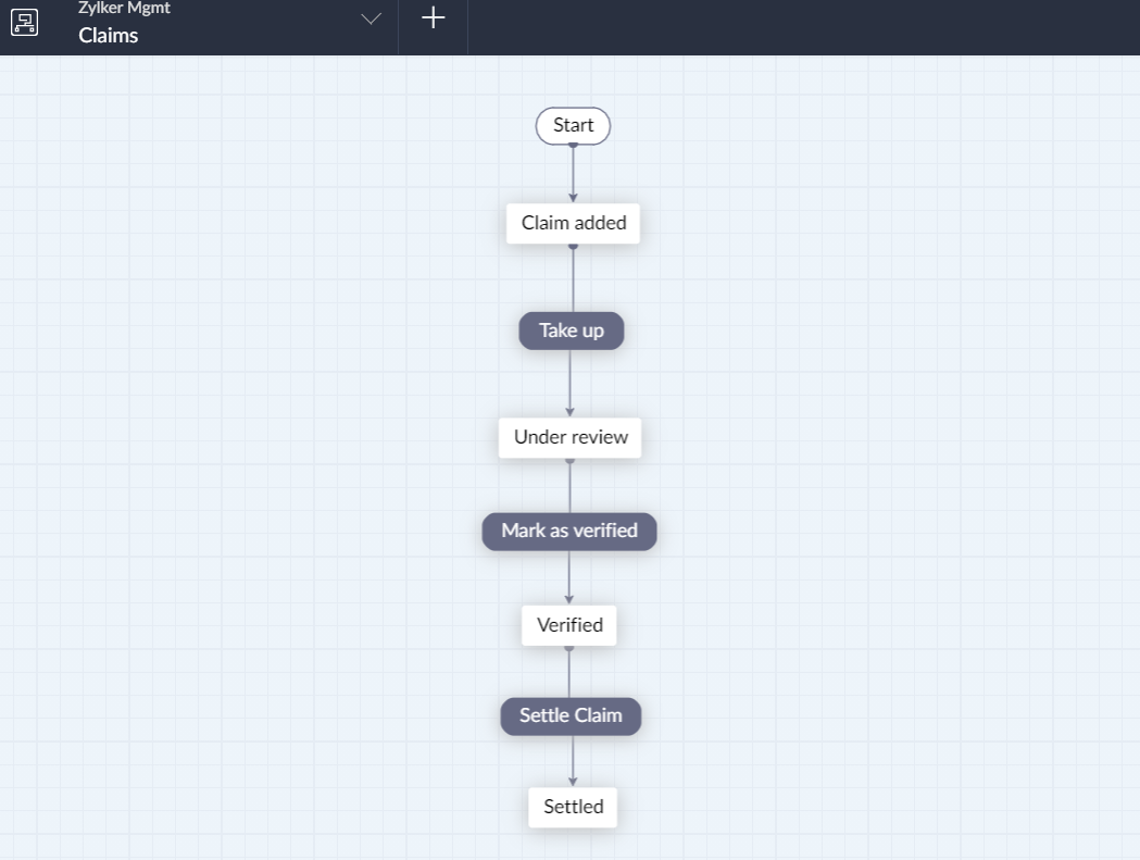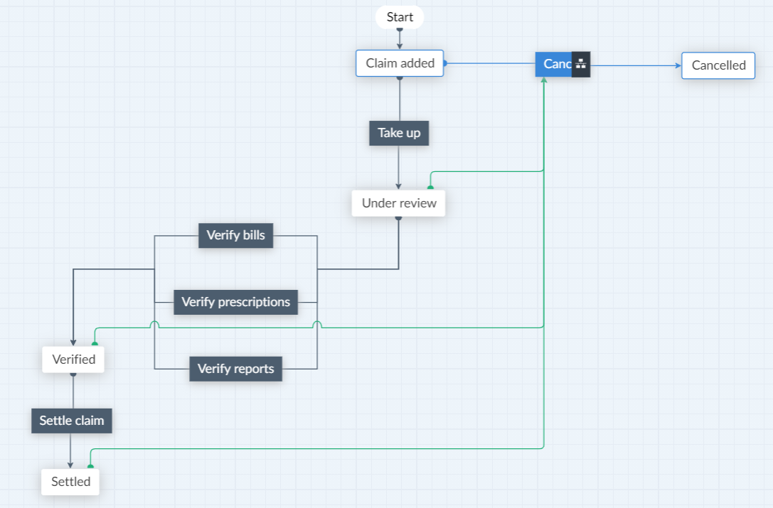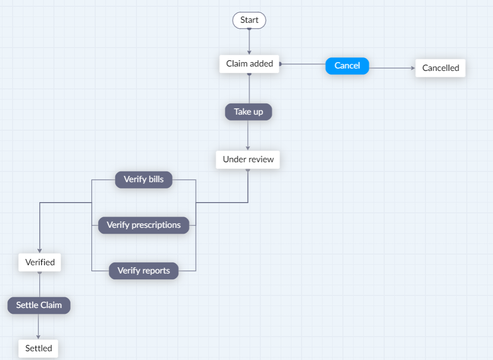 When multiple transitions can are required to move from one stage to another then it known as parallel transition. Some business process required multiple steps in order to move to the next stage. Assume Zylker wants to include additional steps of verification before the claim is approved. Zylker wants to verify the authenticity of the medical bills, medical prescriptions and medical reports. They can achieve this by using parallel transitions.