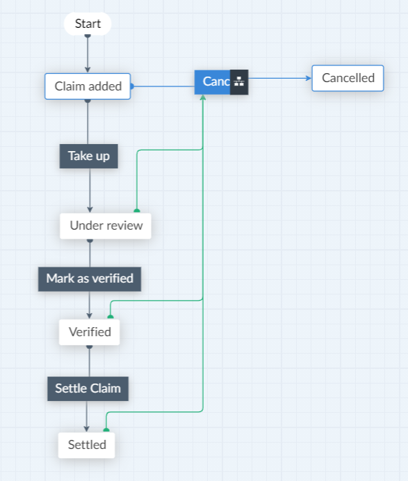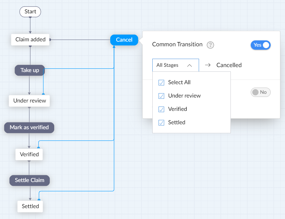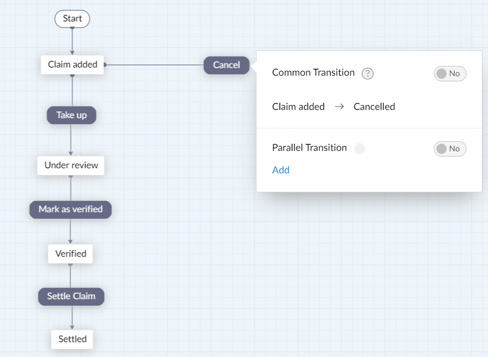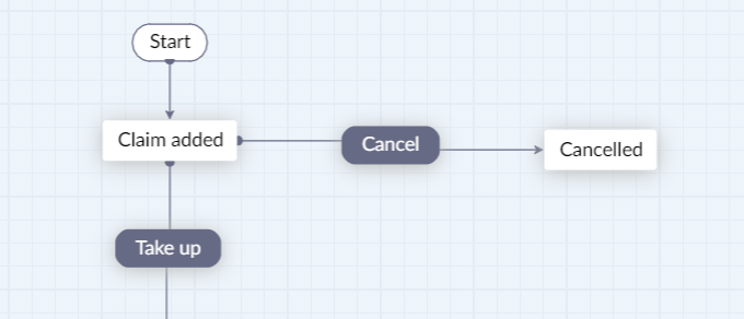 - Now drag and drop the new stage called Cancelled and create a transition between Claim added stage and Cancelled stage.