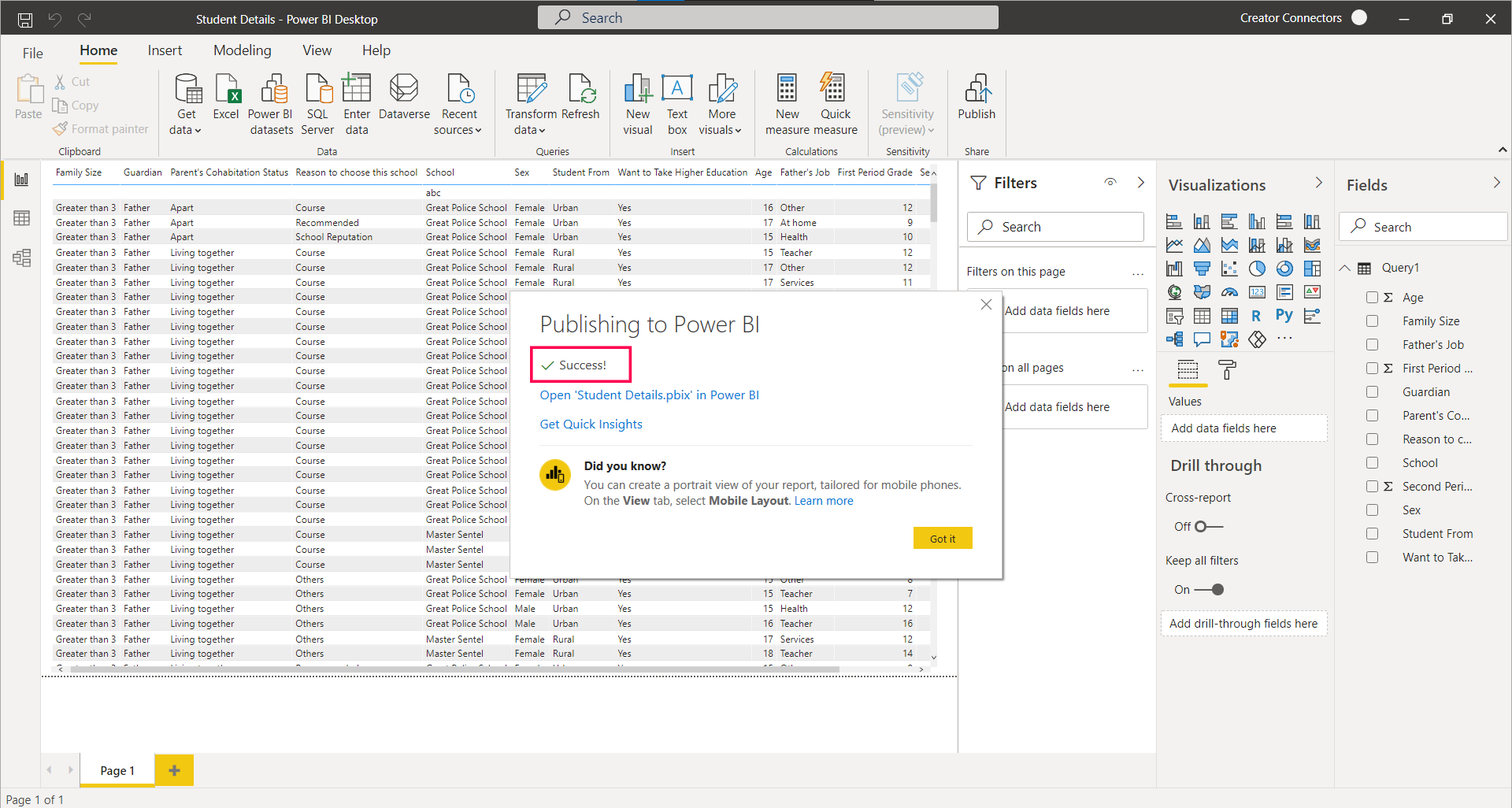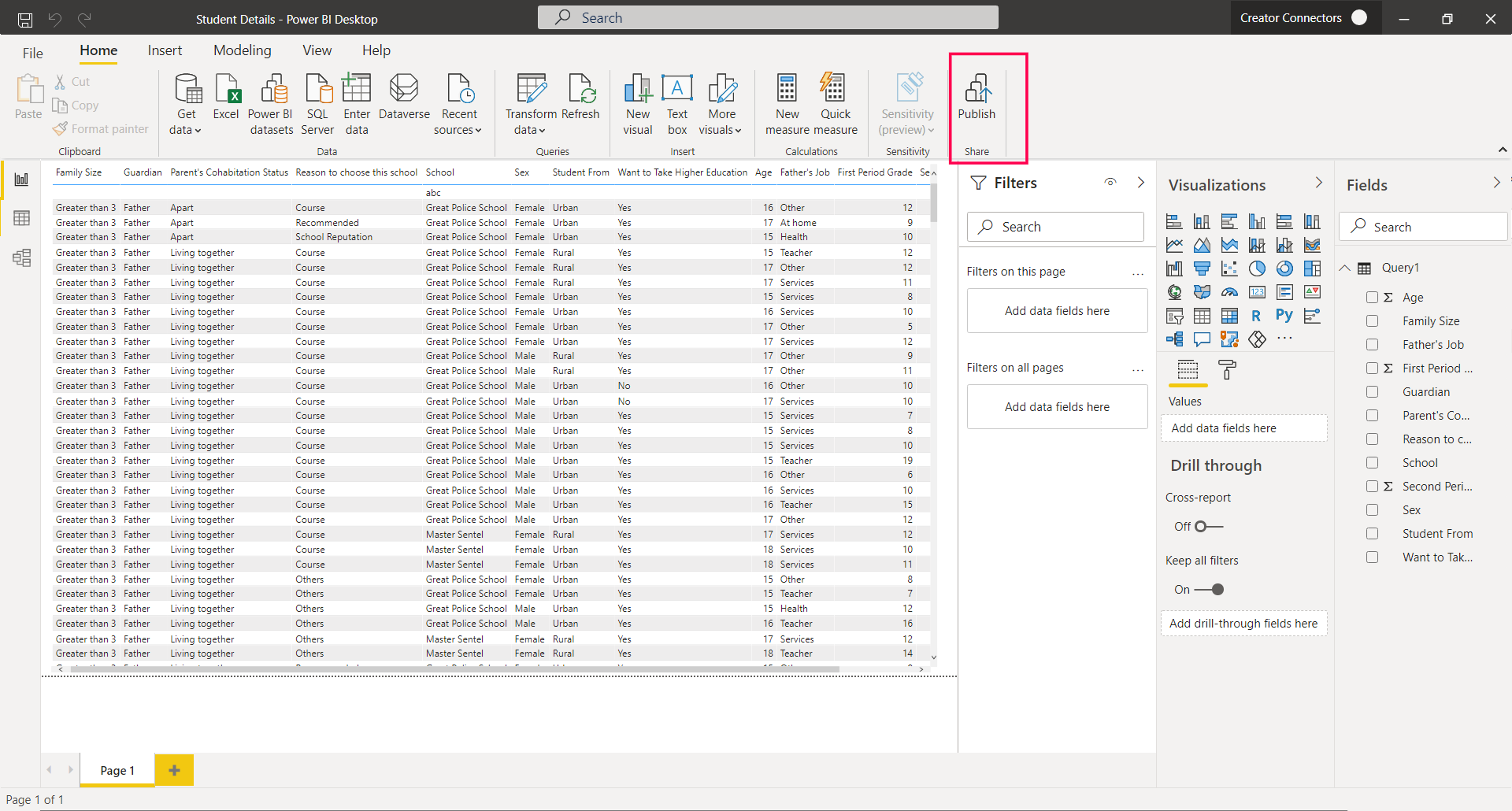 After you have your data ready in Power BI, you can publish it to the cloud. To publish the dataset to the cloud: