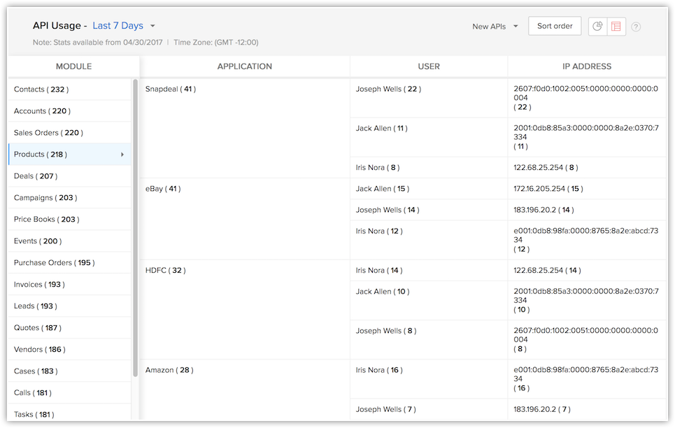 The new API dashboard features an all new interface to view your usage statistics. The interface is made up of a graph view and a table view. You can classify the stats based on modules, IP address from which the call was made, method, user or time. This dashboard supports the previous version of the API as well as the new version.