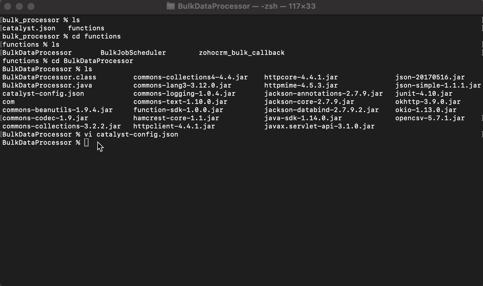 Locate the catalyst-config.json file within functions>BulkDataProcessor and open the file using the following command.