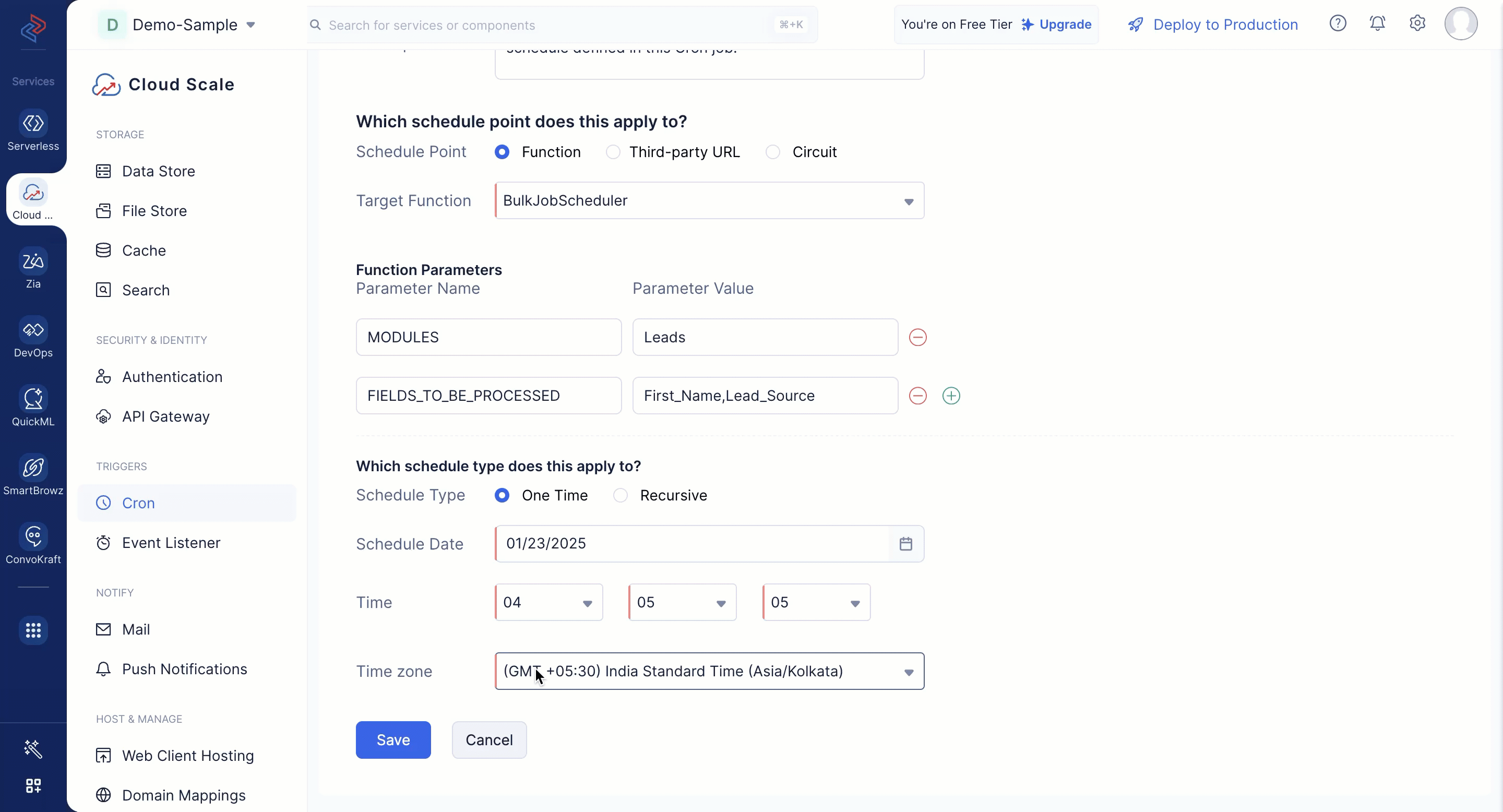 - Go to Cloud Scale > Triggers > Cron and click Create Cron.