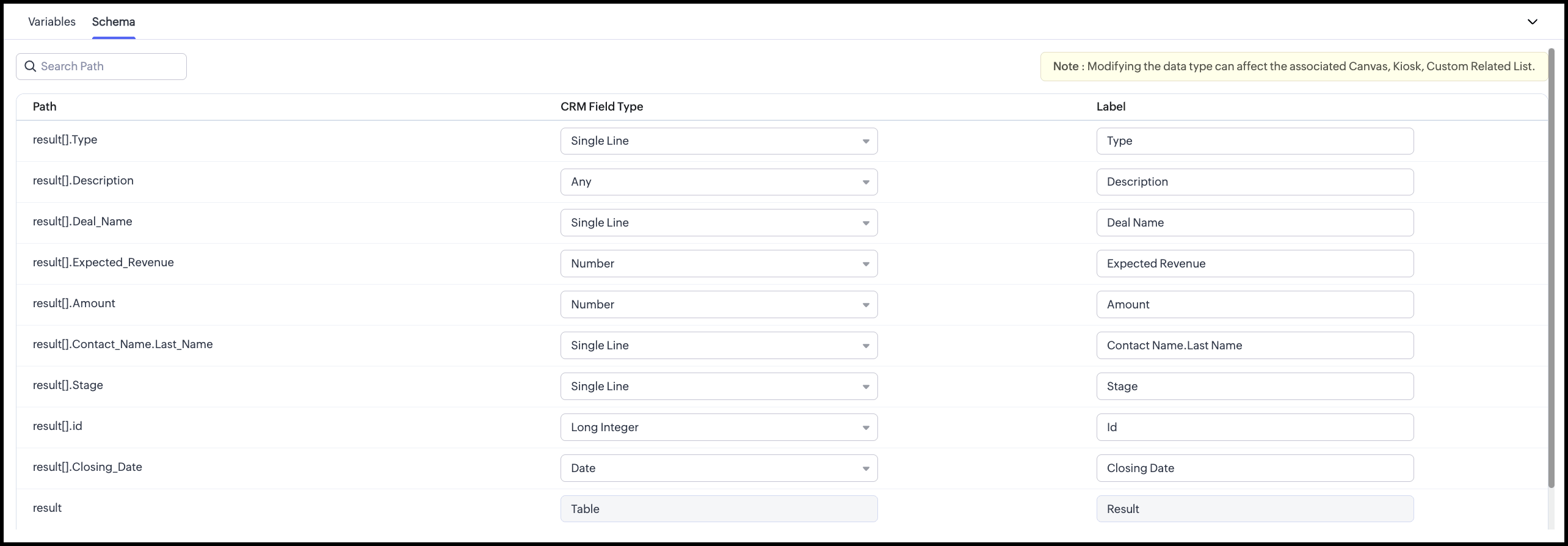 After the query executes, you can see the Schema at the bottom of the screen. Path indicates the JSON path in the response that the field is available in, CRM Field Type indicates it's field type in CRM such as long int, int, and the Label indicates the label/name of the field. You can edit these values based on what you need in the query's response.