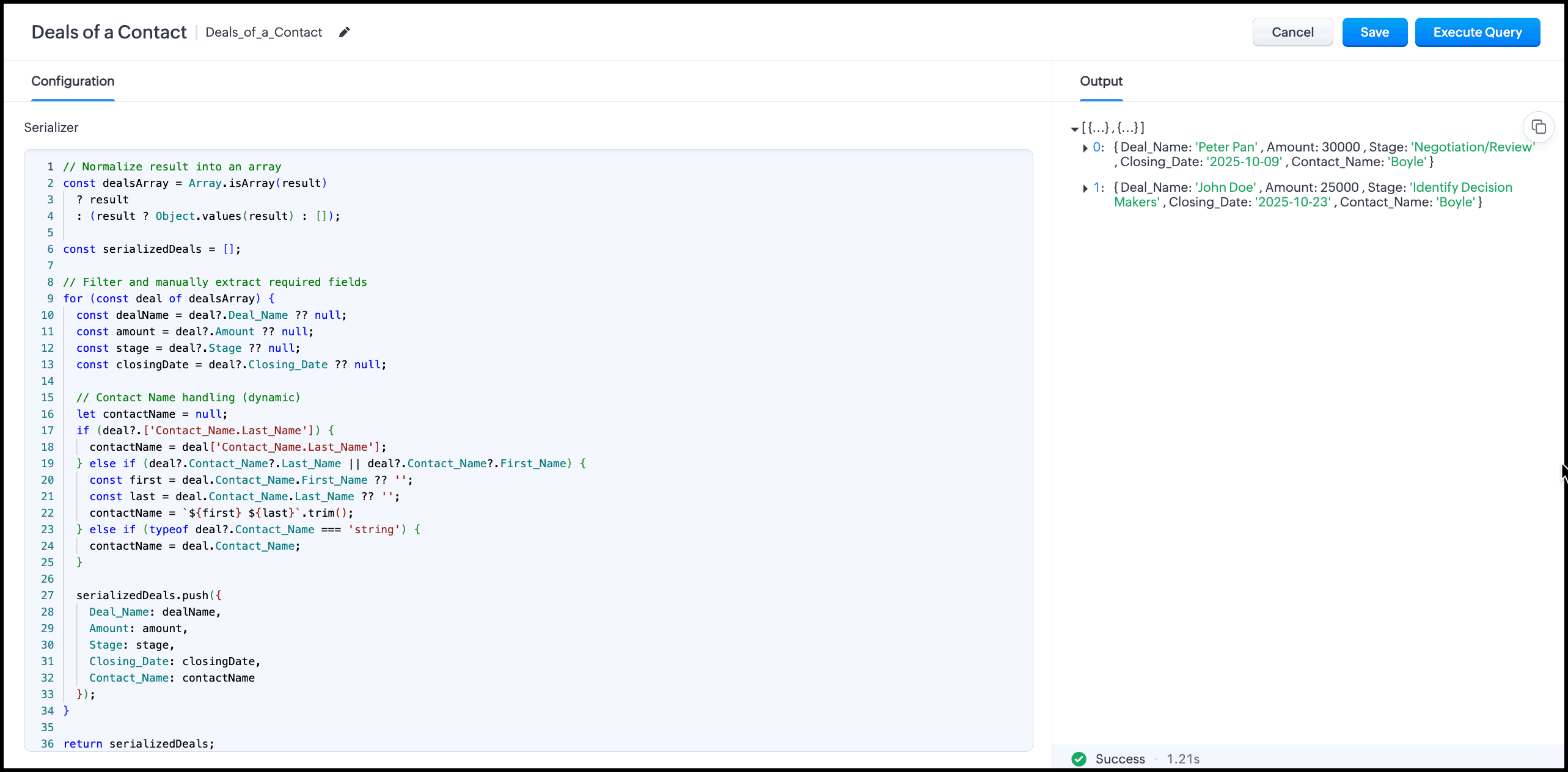 All you have to do is write a query that solves your business need and associate that query with the relevant CRM feature like Canvas, Kiosk etc. This helps you leverage the power of data retrieval using REST API and COQL, along with schema management, serialization of responses, and other functionalities in data handling.