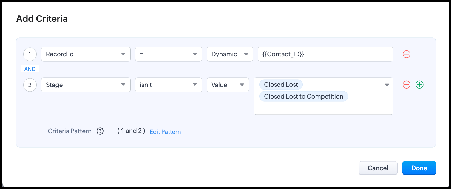 Let us see how to create a query for the Source type CRM - Module. The criteria for the query is to fetch all deals of a contact, whose "Stage" is not "Closed Lost" or "Closed Lost to Competition".