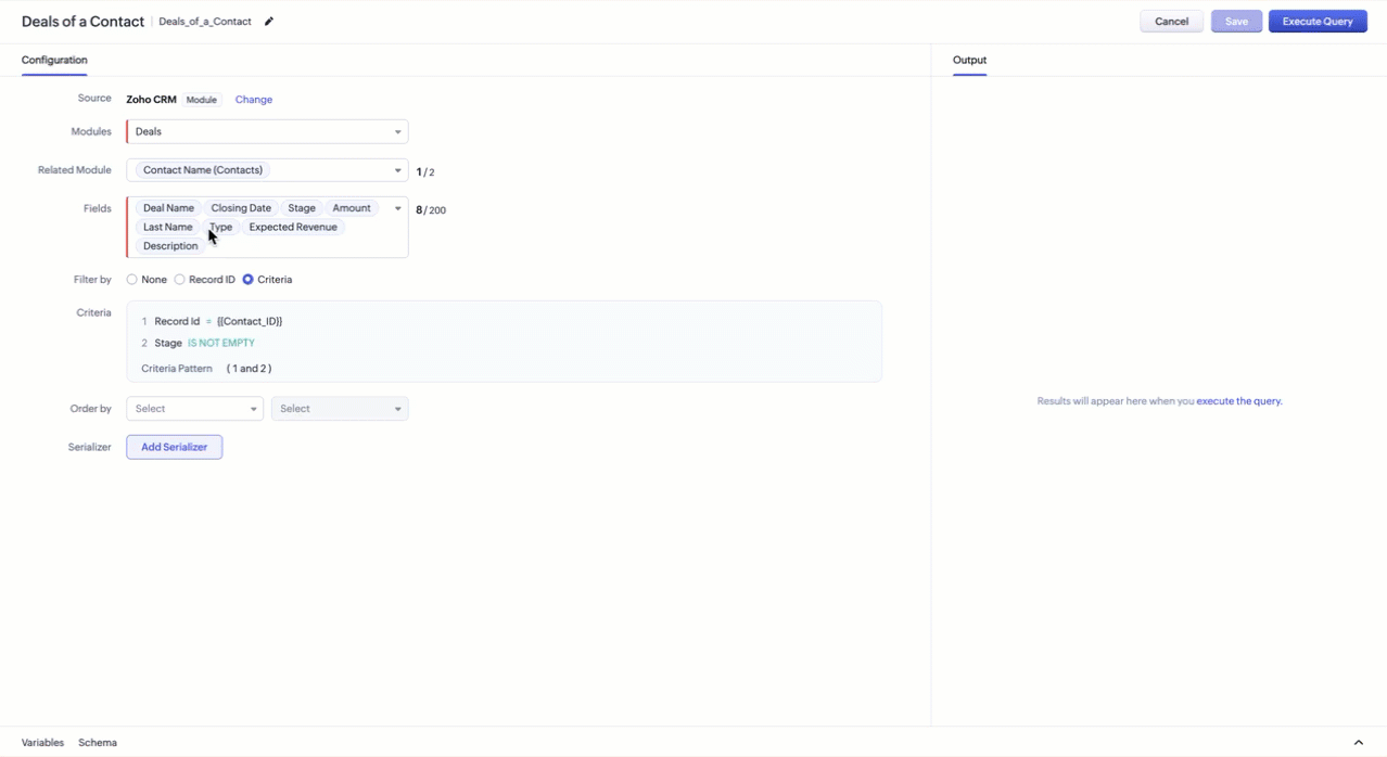 Criteria - You can apply criteria over different fields for which you are creating the query. Criteria supports various comparators and you can also group the conditions using AND or OR operators. You can also choose to give the value for the criterion or choose a dynamic value. Dynamic value means that the value will be taken for this field when the query is used at some place. In this example, we are assigning a variable to get the ID of the contact record that is associated with the deal that meets the criteria.