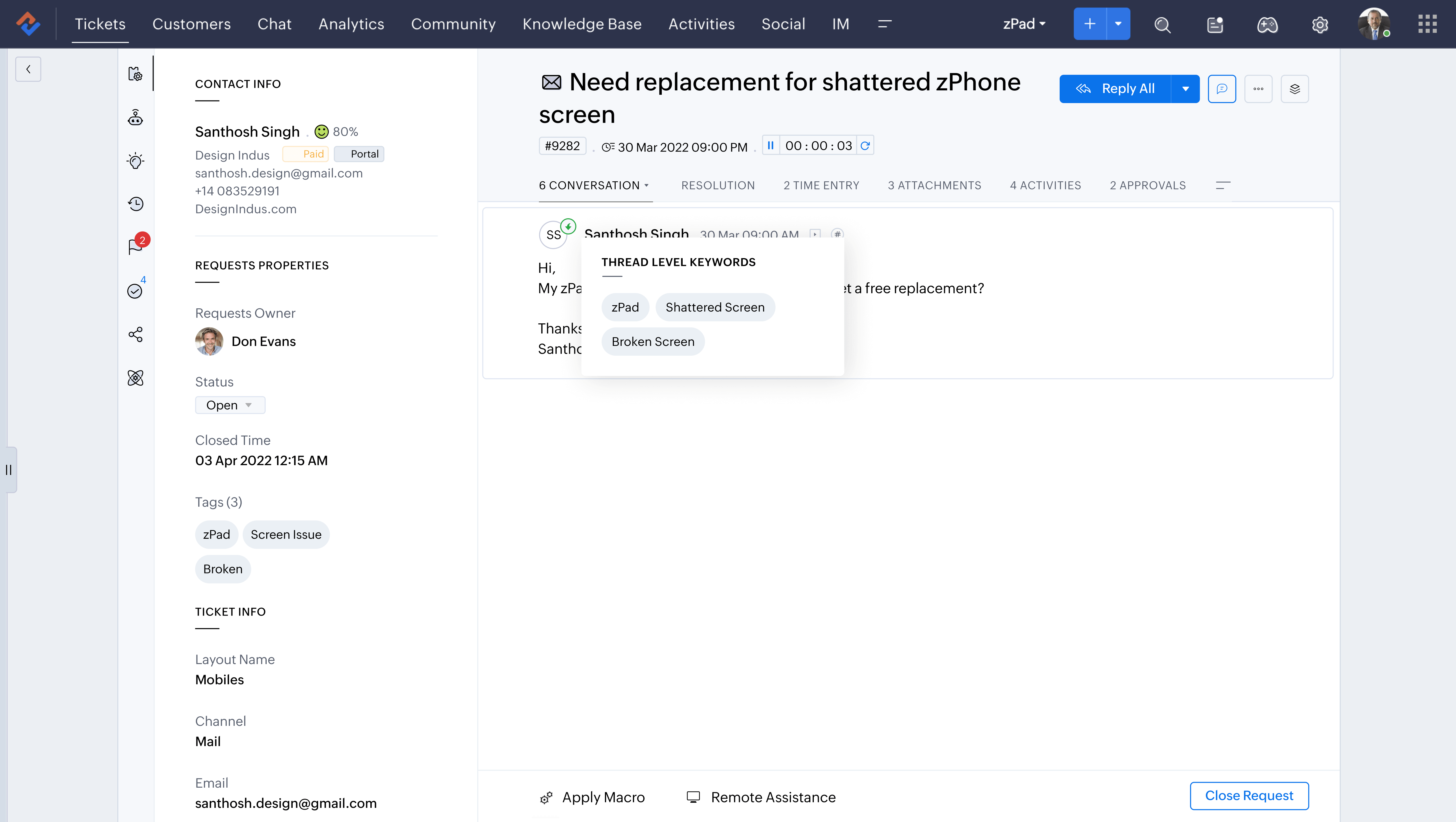 With Zoho Desk, specifically the Zia dashboards, I am able to watch closely how my staff are interacting with the customers and predict things as well. For example, with Zia dashboards, I was able to find out that twice a week between 1 and 4 pm, for whatever reason, we almost doubled our inbound call flow from our customers. So, by using that, we were able to proactively shift and schedule staff and make sure that we're always there for our customers.