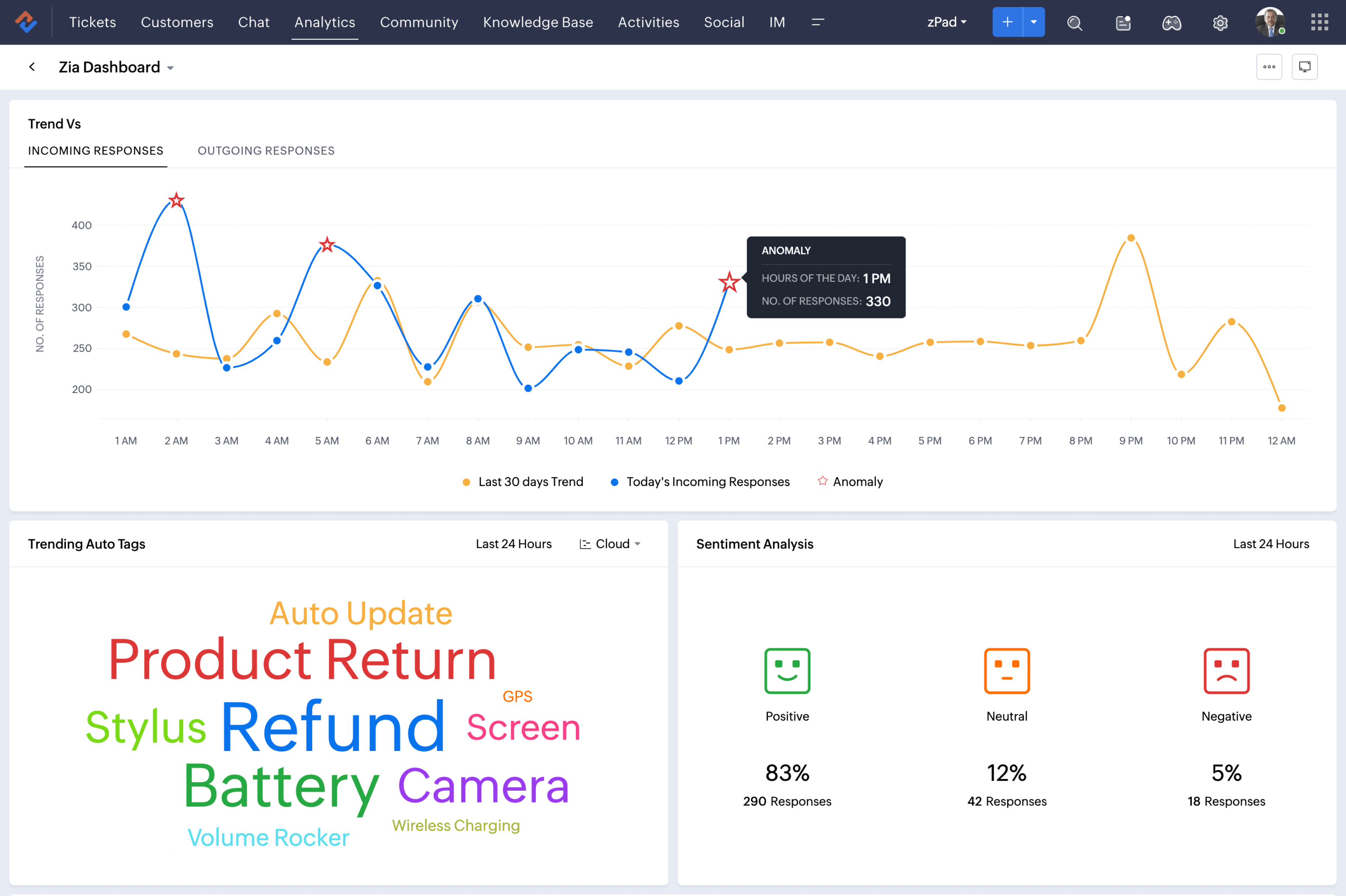 Das Dashboard von Zia zeigt Trends bei Ticket-Tags für die letzten 24 Stunden an.Die Anzahl der erhaltenen Antworten für jedes Stimmungsbild der letzten 7 Tage wird in einem Balkendiagramm veranschaulicht.Der Prozentsatz und die Anzahl der Antworten für jedes Stimmungsbild werden unter Emotikons der Stimmungslagen Glücklich, Neutral und Traurig veranschaulicht.