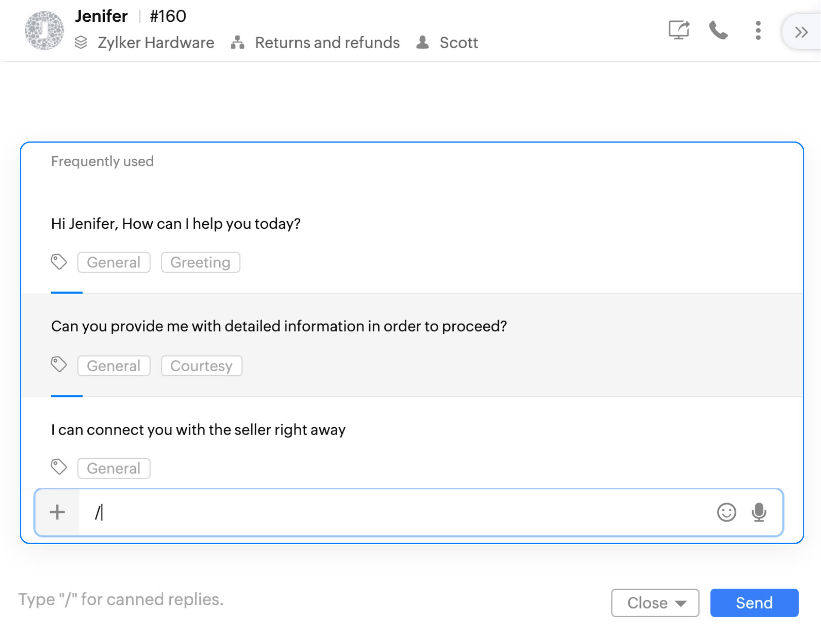 Wir bieten Ihnen auch etwas, das Sie bei häufig aufkommenden Fragen unterstützt, die Sie eigentlich vorhersehen können. Speichern Sie allgemeine Antworten, Begrüßungen und Fragen als vorgefertigte Antworten und nutzen Sie Tastenkombinationen, um sie während des Chats mit einer Tastenkombination aufzurufen.