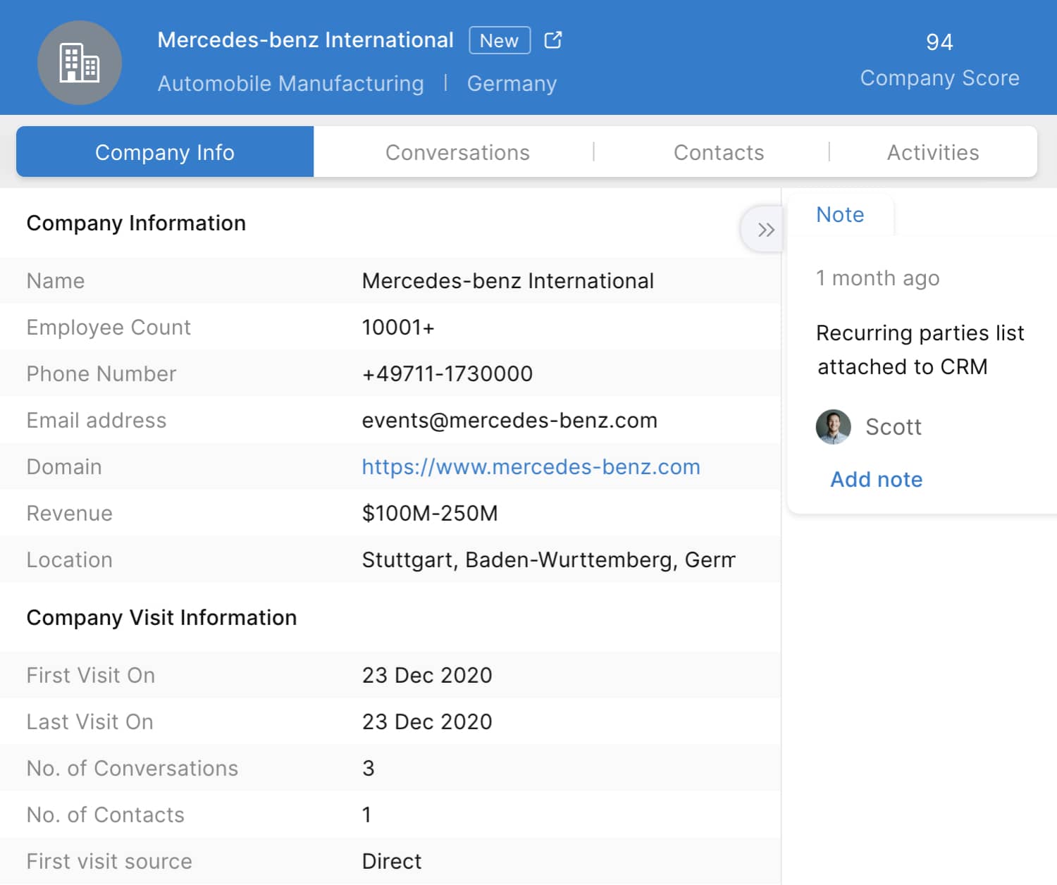 Die Zufriedenheit von Firmenkunden, die Ihr Cateringangebot nutzen, kann sich stark auf Ihren Gewinn auswirken. Unsere Profilanreicherung, die von Zia gestützt wird, unterstützt Sie dabei, Websitebesucher aus verschiedenen Unternehmen zu identifizieren und relevante Details zu erfassen, um automatisch Banner mit Rabatten für Unternehmen auszulösen. Sie können auch Daten aus Ihrem CRM nutzen, um die Menüpakete anzuzeigen, die zuvor von dem jeweiligen Unternehmen ausgewählt wurden.