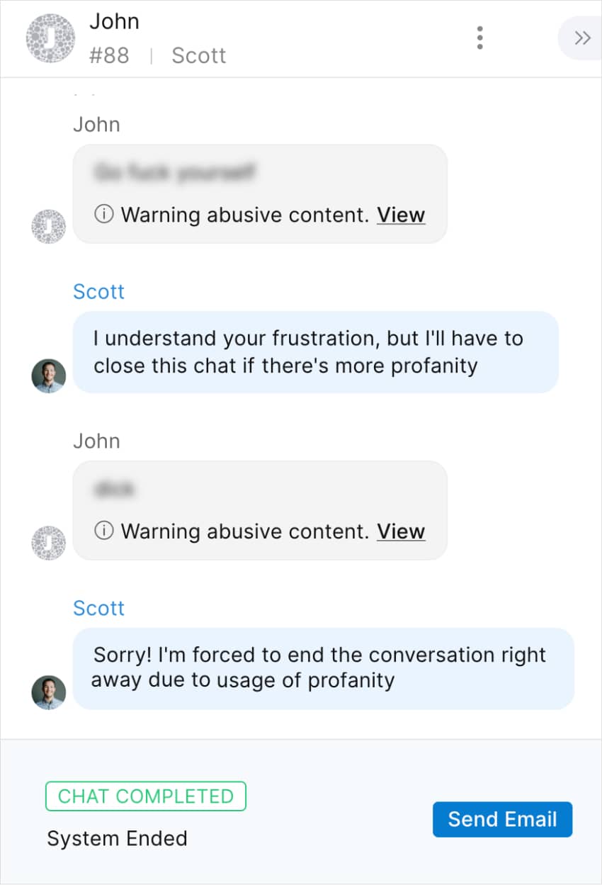 Es gibt Situationen, in denen eine Unterhaltung beendet werden muss, wenn z. B. ein verärgerter Kunde beleidigend geworden ist oder ein Troll Ihren Chat entdeckt hat. Zum Schutz Ihres Teams können Sie mit SalesIQ Chatschließungen konfigurieren und IP-Adressen sperren, wenn Kunden beleidigende Sprache verwenden. Botsitzungen, in denen solche Wörter verwendet werden, werden automatisch geschlossen und die IP-Adresse wird ohne Weiterleitung an einen Mitarbeiter blockiert.
