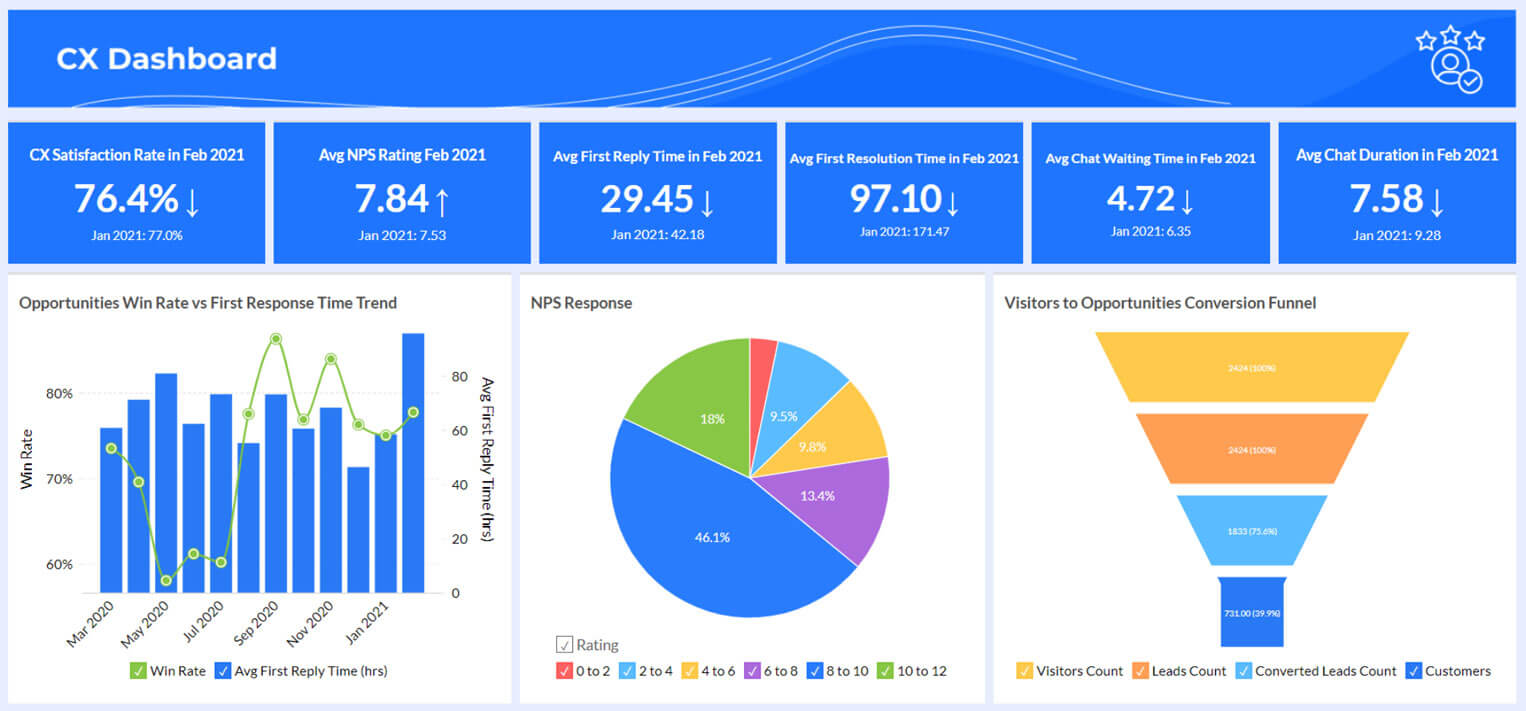 Verfolgen Sie die Kennzahlen zur Kundenbindung und zum Kundenservice für Ihre App und Website mithilfe der umfassenden Berichte von Zoho SalesIQ und nutzen Sie die Zoho Analytics-Integration, um ein besseres Verständnis dafür zu entwickeln. Sie können auch Daten aus Zoho CRM, Zoho Desk, Salesforce CRM und mehr mit Zoho SalesIQ zusammenführen, um durchgängige multifunktionale Analysen durchzuführen.