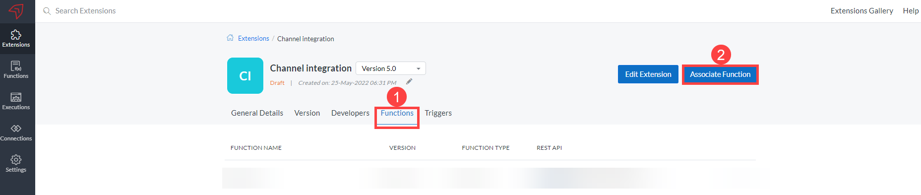 3. In General Details page of the extension, go to Functions tab and click Associate Function.