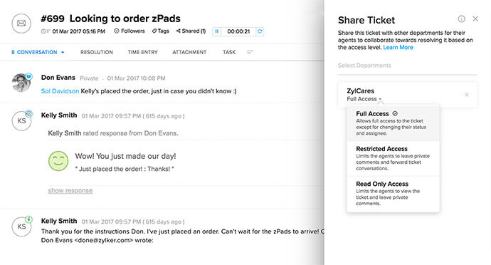 The Team Feed shows your agents the gist of what's happening with every ticket assigned to their team. With just an @mention, your colleagues and teammates can view tickets and pitch in when they need to. If a certain ticket requires approval from superiors, your agents can send them over to the superior and the request can be approved with just a click. To stay up-to-date on all activity, you can follow a ticket and get notified of all activity such as comments and status updates.
