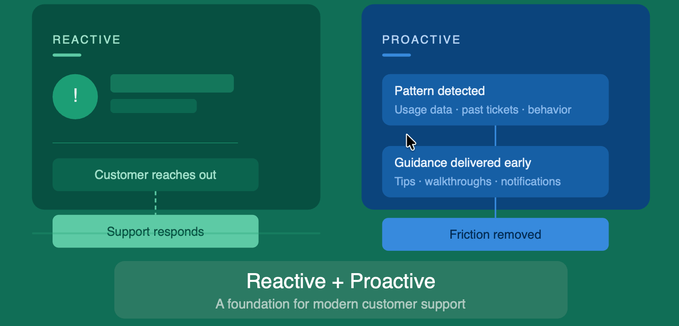 Reactive support cannot always meet customer expectations. Often the customer has already experienced a problem before the support team gets involved. The customer might have already spent time trying to figure things out on their own, going through various documentations or waiting for a response from the support team. Even if the issue is addressed quickly, the overall experience might still feel disruptive.