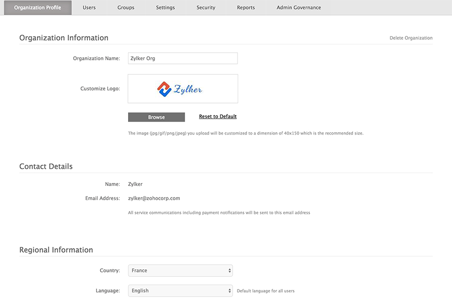 Make Zoho Docs a part of your organization. Replace the default logo with your company logo and choose a language based on your users and their locations.