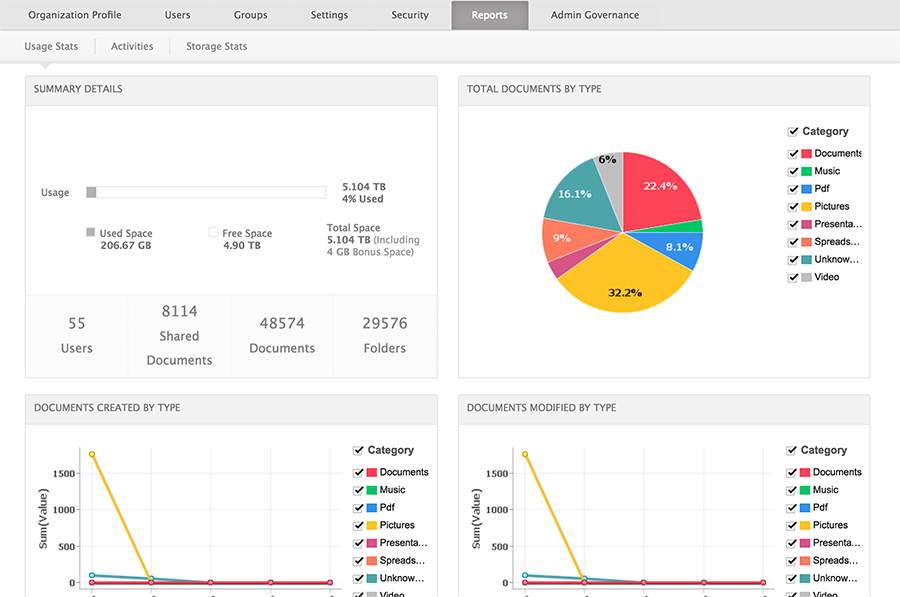 Use admin reports to monitor all user activities, including the storage space summary, as well as document type and volume of documents over a set period of time.