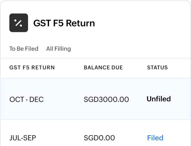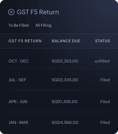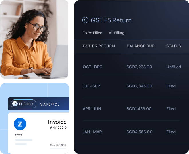 Staying compliant and computing taxes is made simpler than ever with Zoho Books. Automatically apply appropriate GST tax rates for different transactions. Generate F5 tax returns seamlessly within the software for easy filing with the IRAS.