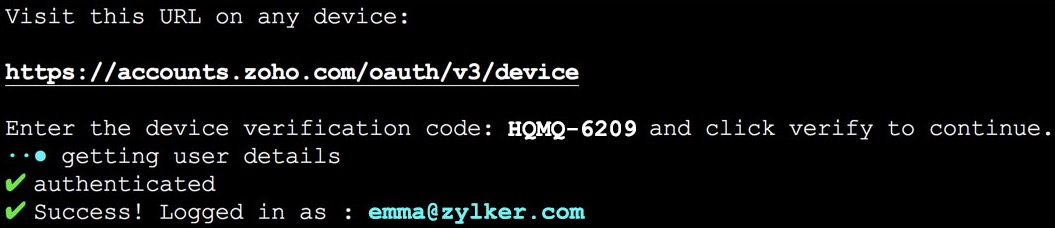 After executing the command, follow the same steps as for catalyst login to log in to your online Zoho account from the CLI.