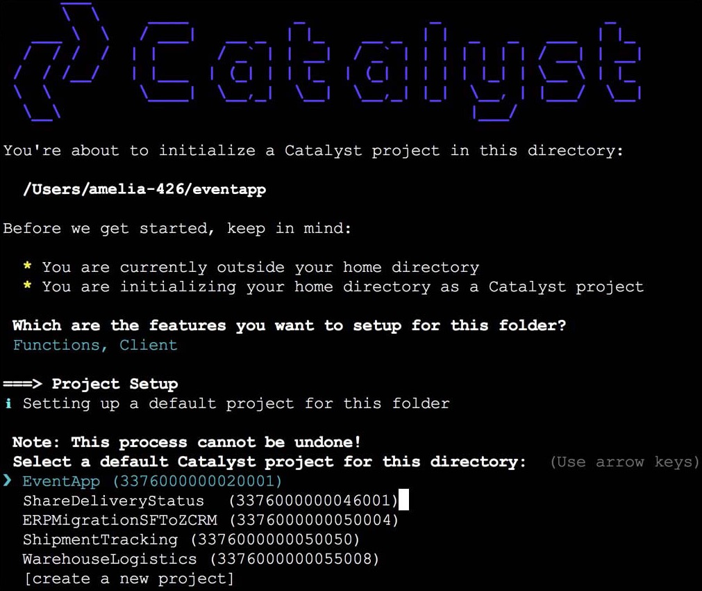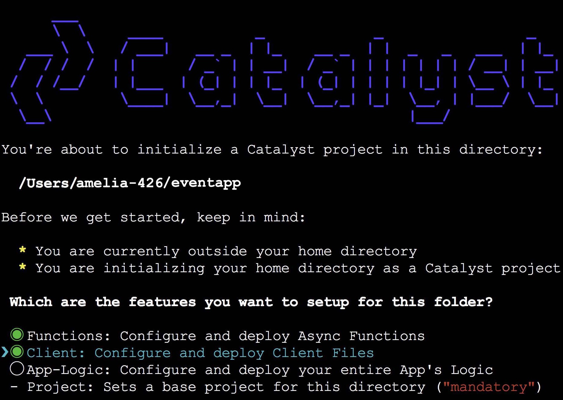 The CLI will now ask you to associate a Catalyst project with the directory. Associate it with the project that we created earlier. Select EventApp from the list and press Enter.