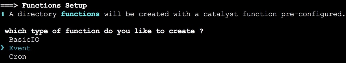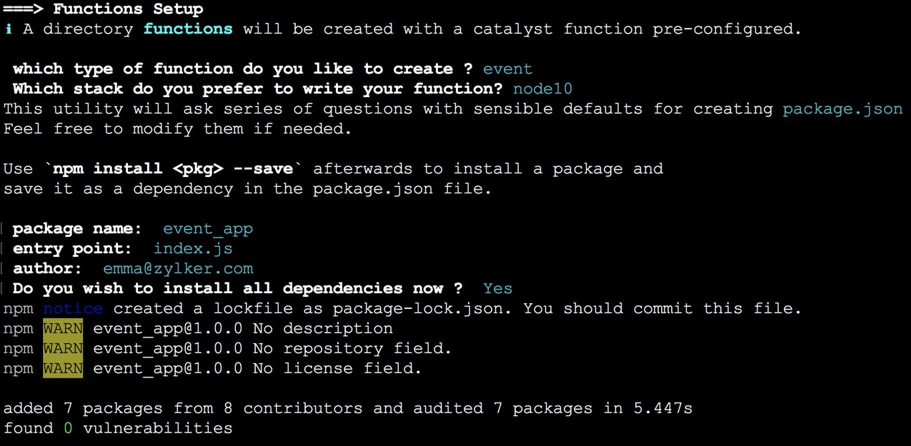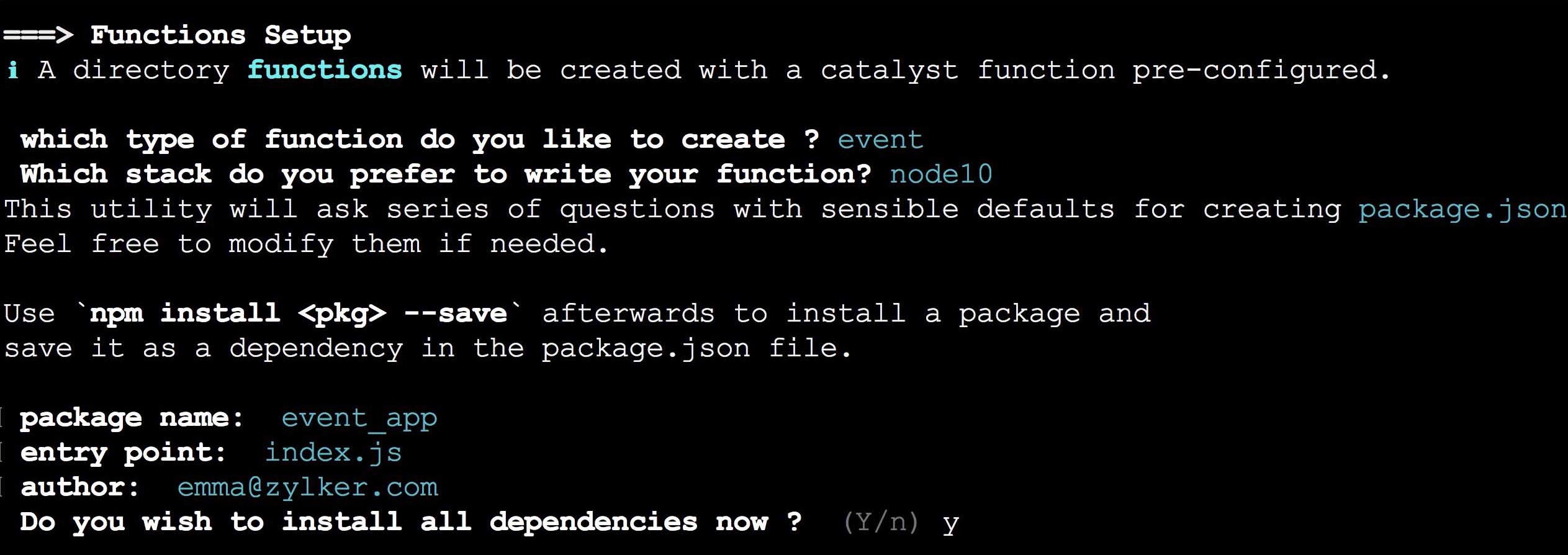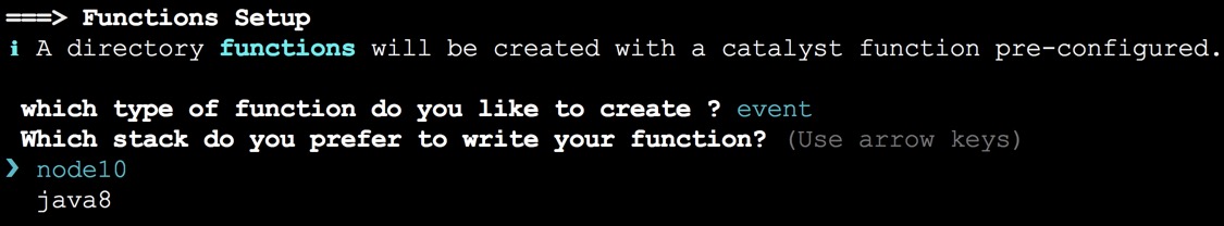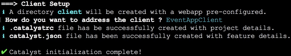Your project directory is now set up with the client directory and the functions directory along with configuration files and dependencies. The project directory also contains the catalyst.json configuration file and a hidden catalyst.rc file.