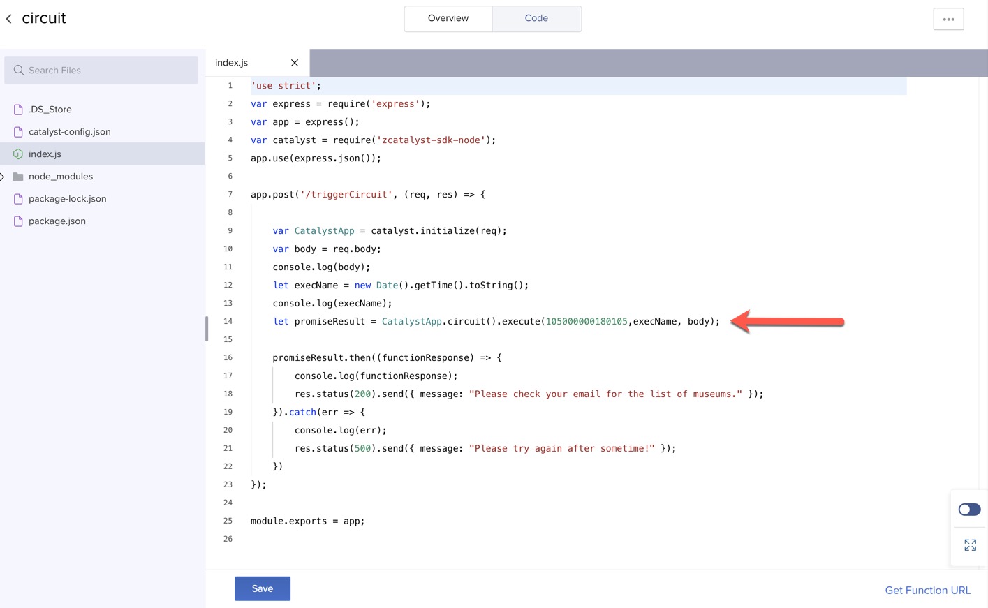 - Click the Code tab and open index.js by clicking it. Paste the Circuit ID that you copied on line 14 and click Save.
