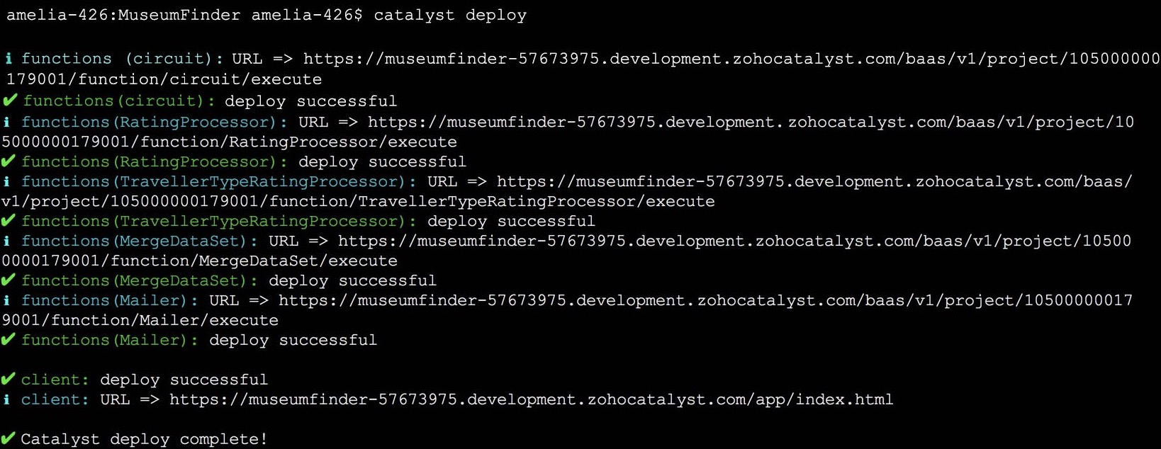 The functions are deployed first, followed by the client component. The production URLs of the components are displayed.