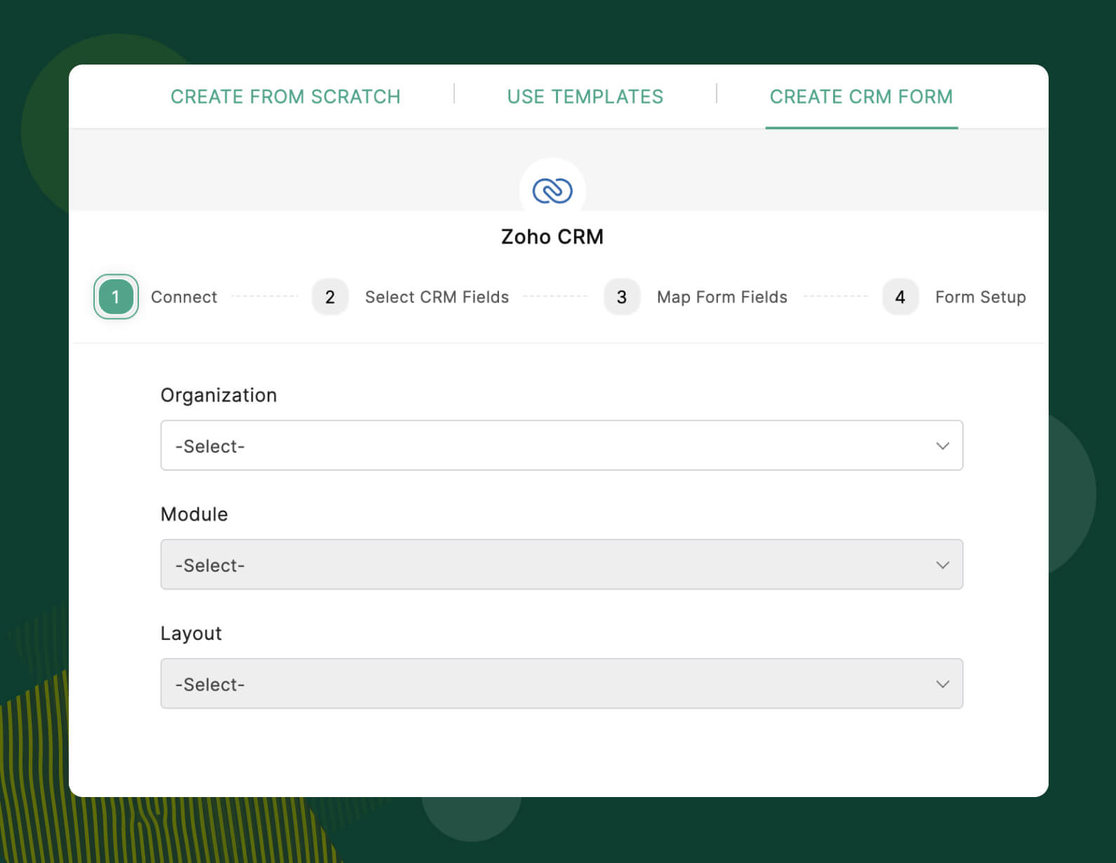 In Zoho Forms, go to Create Form > select CRM Forms. Choose the Zoho CRM module (like Leads, Contacts, Deals, etc.) you want to collect data for. The form will auto-generate with fields from that module. You can customize it, add or remove fields, then publish the form. All submissions will be automatically synced to your Zoho CRM account. Learn more on how to set up CRM Forms.