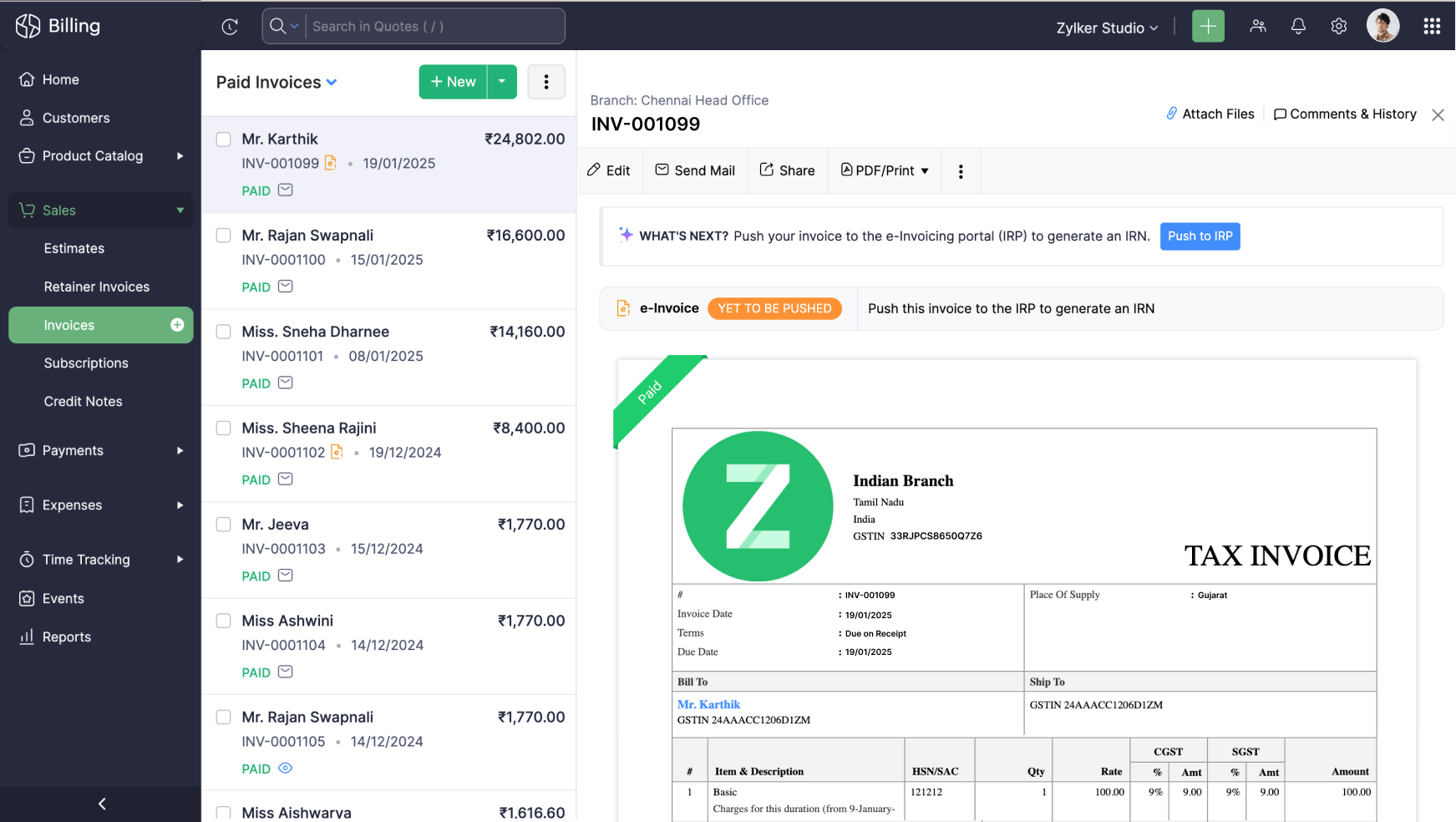 Send IRN-verified and QR code-enabled invoices to your customers effortlessly.