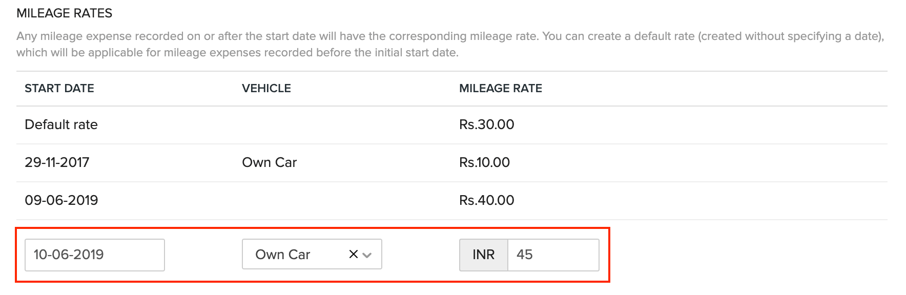 Mileage rates are used to calculate the expenses for travel based on the number of kilometers/miles travelled. Mileage rates can be recorded for different days. So when you record an expense for that particular day, the corresponding mileage will be applied.