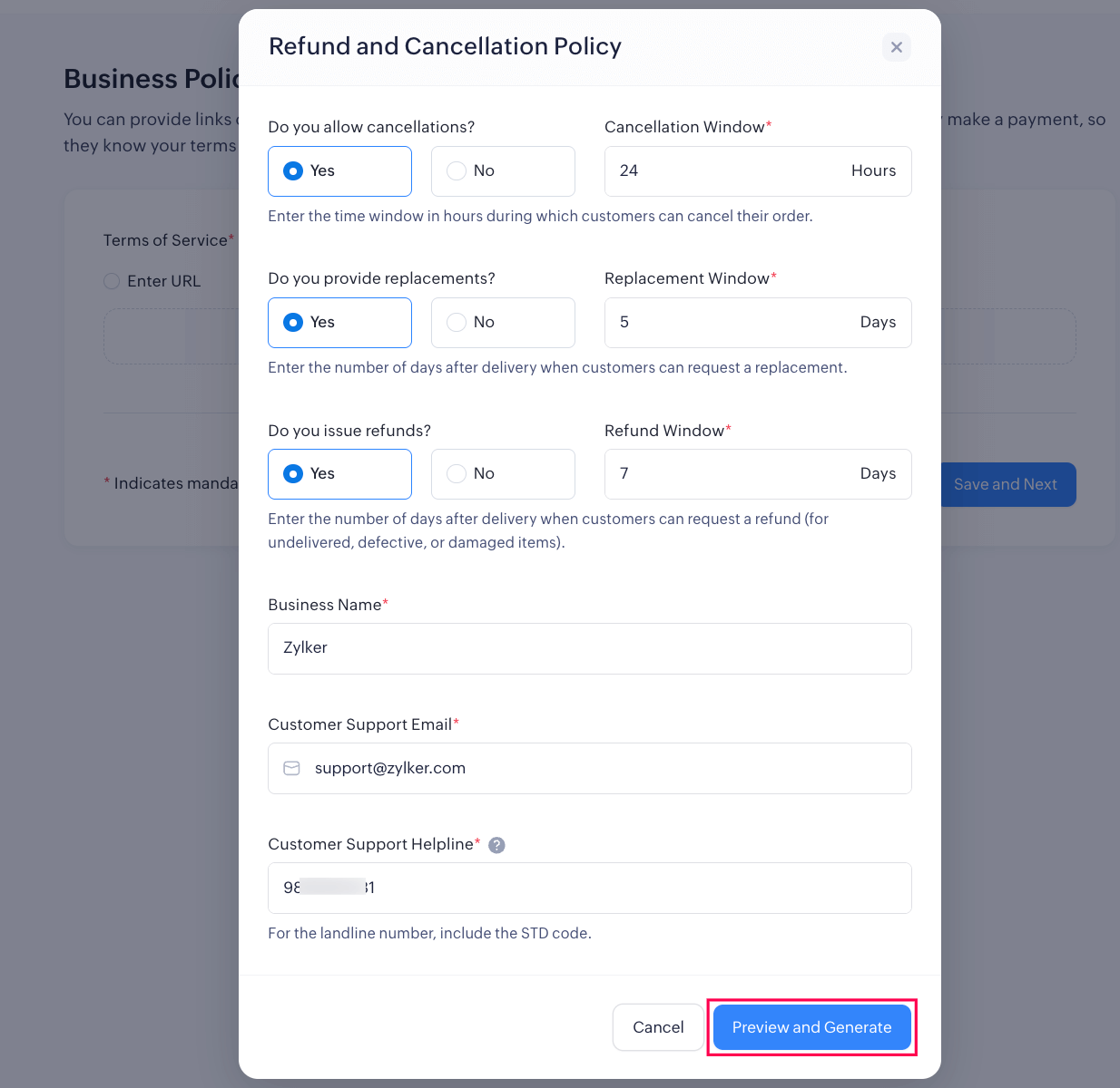 Enter your Business Name, Customer Support Email, and Customer Support Helpline.