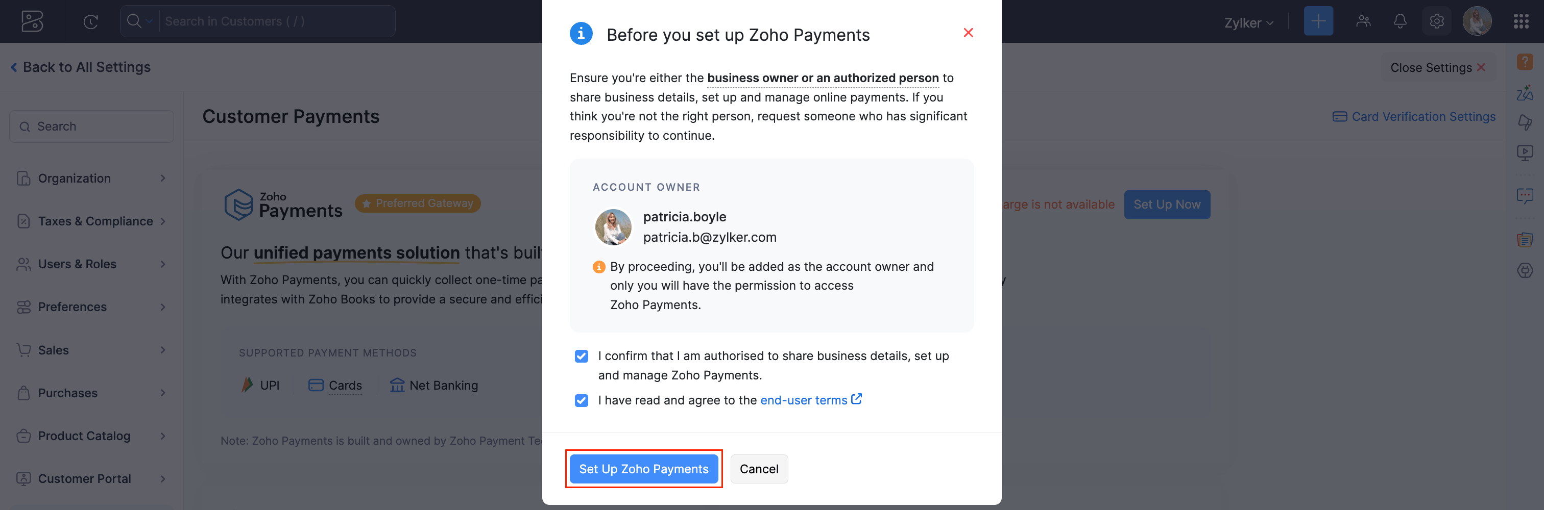 Check the box to confirm that you’re authorized to set up and manage Zoho Payments.