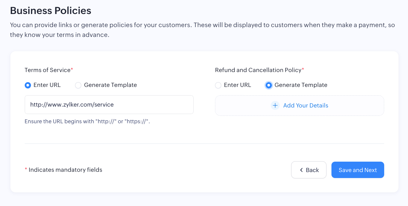 Zoho Payments requires policy URLs from your website so they can be verified and displayed at checkout, helping customers understand your business practices.