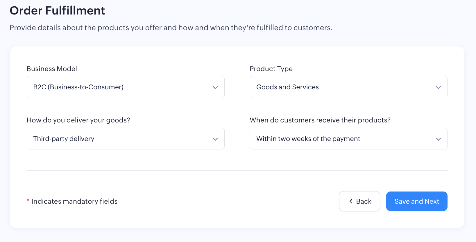 Warning: Ensure you provide the correct details as you cannot change this setting from the application once you create your account. You can contact support@zohopayments.com if you want to change your business type and initiate the verification process once again.
