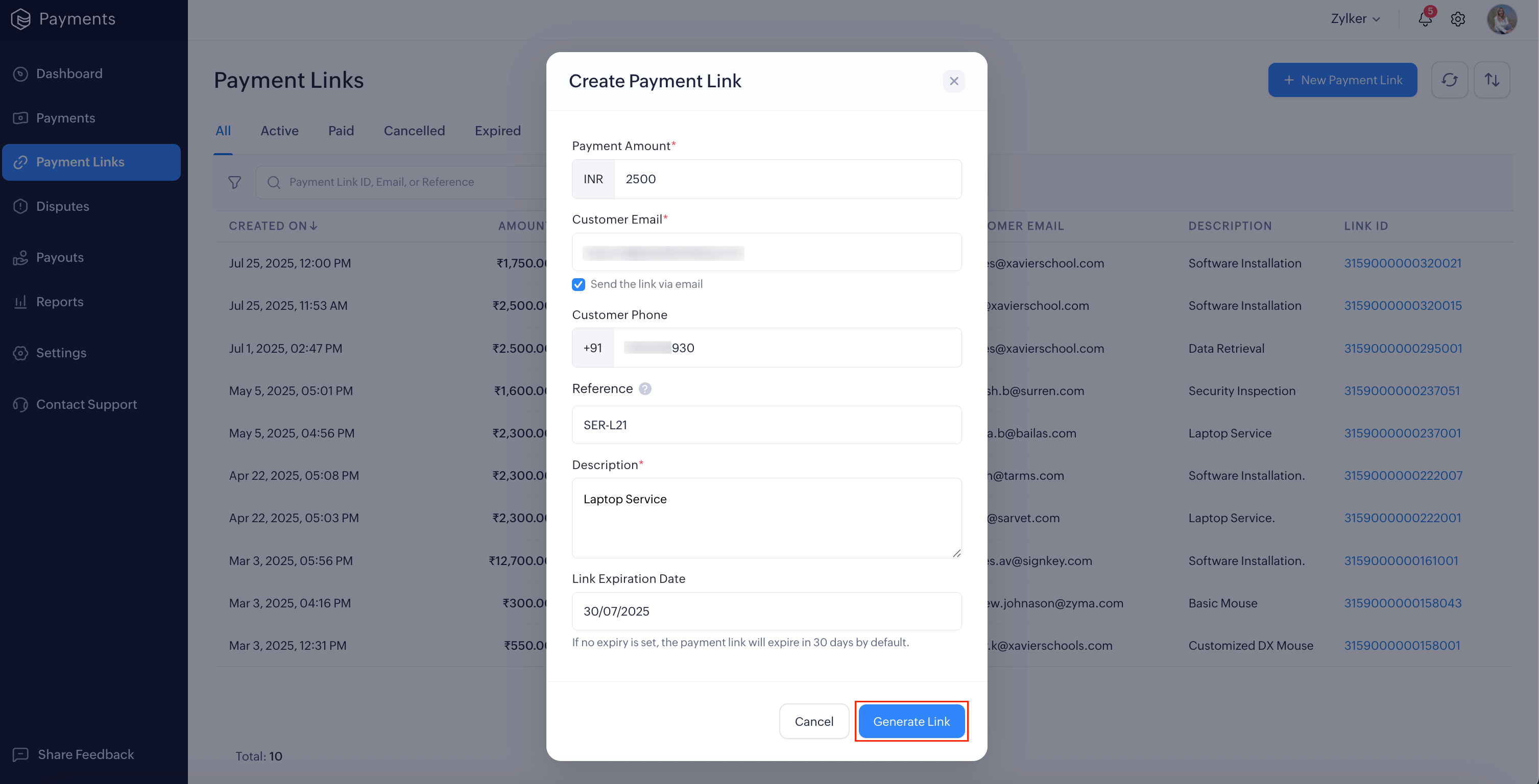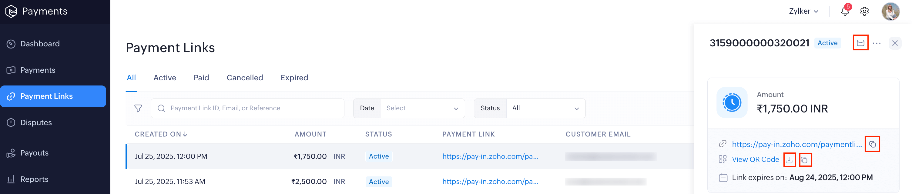 Zoho Payments allows you to generate payment links quickly with just a few simple clicks. You can then share these links with your customers and track the payment status in real time from the Payment Links module.