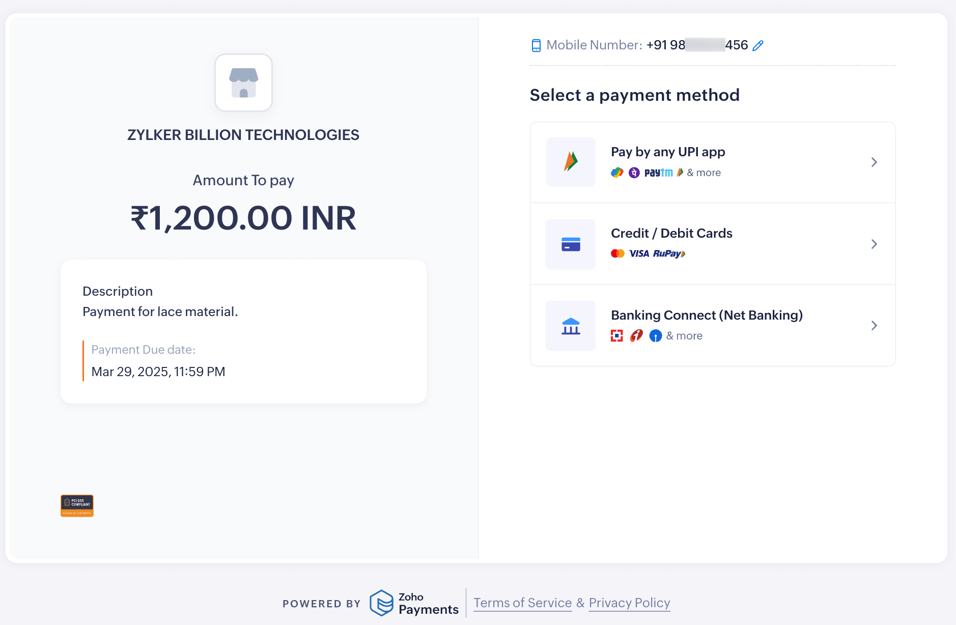 Once you create a payment link in Zoho Payments and share it with your customers, they can make an online payment through the link.